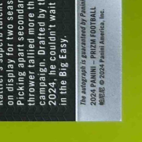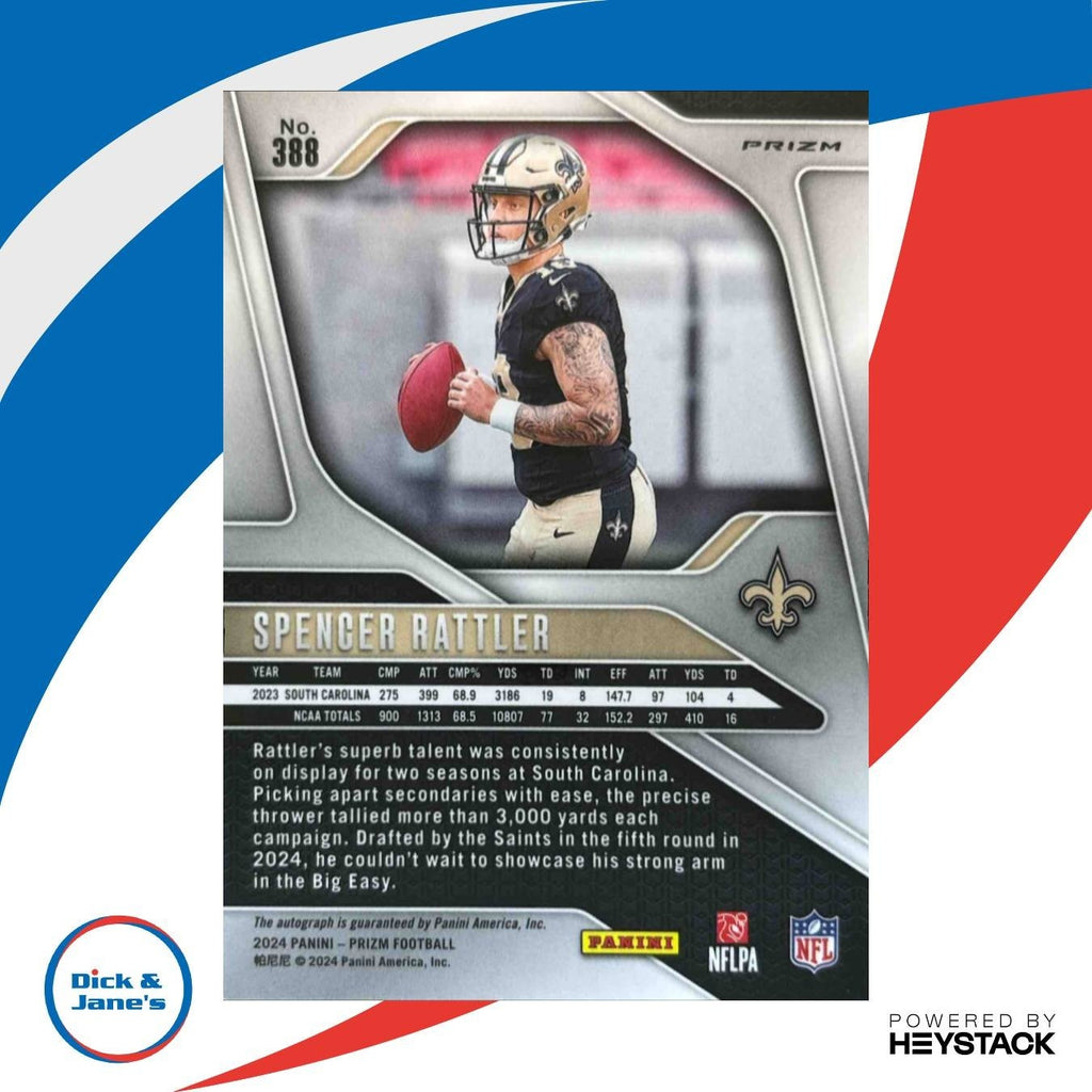 The 2024 Panini Prizm Spencer Rattler Auto Silver #388 RC trading card features the rising star quarterback of the New Orleans Saints. This rare card is a must-have for any NFL collector, showcasing Rattler's autograph and rookie card designation. Don't miss out on adding this valuable piece to your collection! Listed With Mascot.
