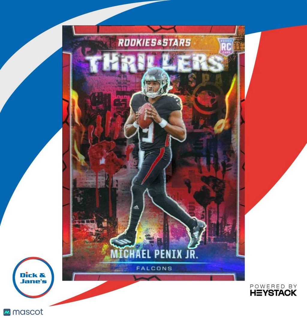 Own a piece of NFL history with the 2024 Panini Rookies & Stars Michael Penix Jr. Thrillers Red 64/99 RC Falcons trading card. This rookie card is a must-have for any football fan, featuring limited edition red foil and a low serial number. Add this rare collectible to your collection today! Listed With Mascot.