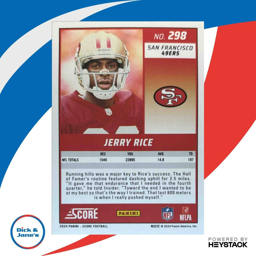 This 2024 Panini Score Jerry Rice Stars card is a must-have for any San Francisco 49ers fan! Limited to 399 cards, this rare find features the legendary wide receiver in action. Don't miss your chance to own a piece of NFL history. Add it to your collection today! Listed With Mascot.