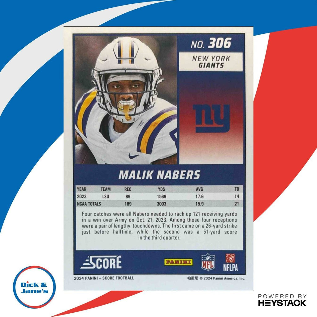 The 2024 Panini Score Malik Nabers #306 RC New York Giants sports trading card is a must-have for any NFL collector. This rookie card features a talented player from the New York Giants, making it a valuable addition to any collection. Don't miss out on owning this rare and exciting card! Listed With Mascot.