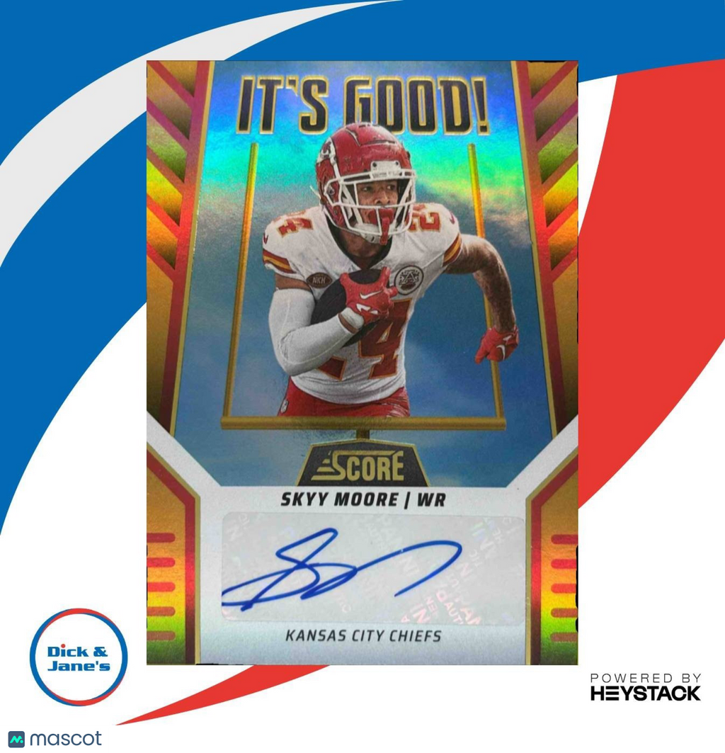 Own a piece of NFL history with this 2024 Panini Score Skyy Moore trading card. Featuring an authentic autograph from the Kansas City Chiefs player, this card is a must-have for any football fan. Add it to your collection today! Listed With Mascot.