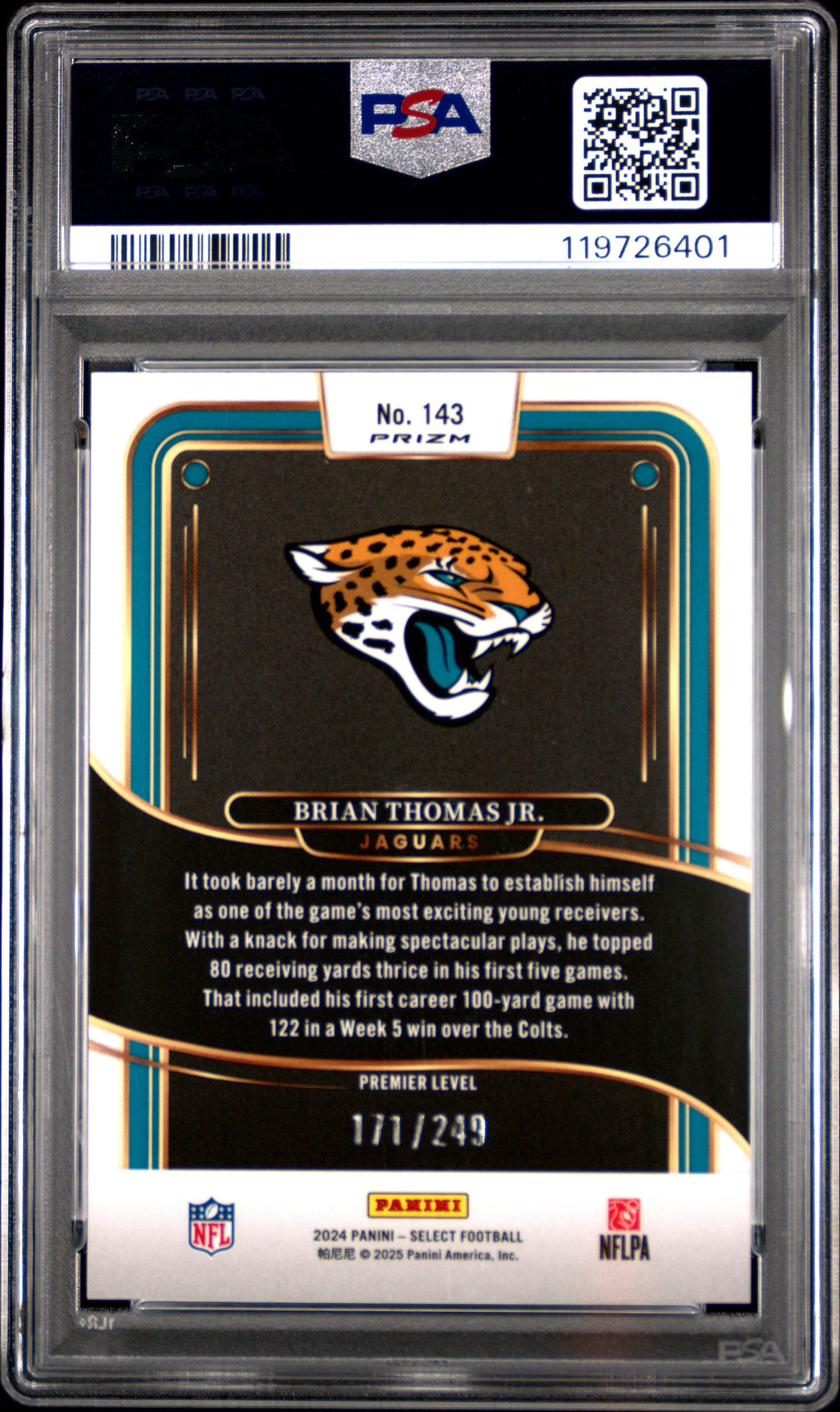 You are purchasing the following: 2024 Panini Select Brian Thomas JR. Tri Color Prizm #143 PSA 10 . You will receive the exact item in the photographs. Note: Please do not connact us and asking the following: 1. What is the lowest you would take? Just make an offer. If the offer is automatically declined, you have your answer. 2. What the best you can do? See above. Not repling to an email is a reply. 3. Any room on this? See above. Not repling to an offer is a reply. 4. We ONLY do one counter offer, so please make your best offer the first time! Note: If the price off, in your option, please send your resaoning and an offer. We will review it. Note: We manage nearly 10 millon cards regularly and will adjust prices as errors are noticed or pointed out! Listed With Mascot.