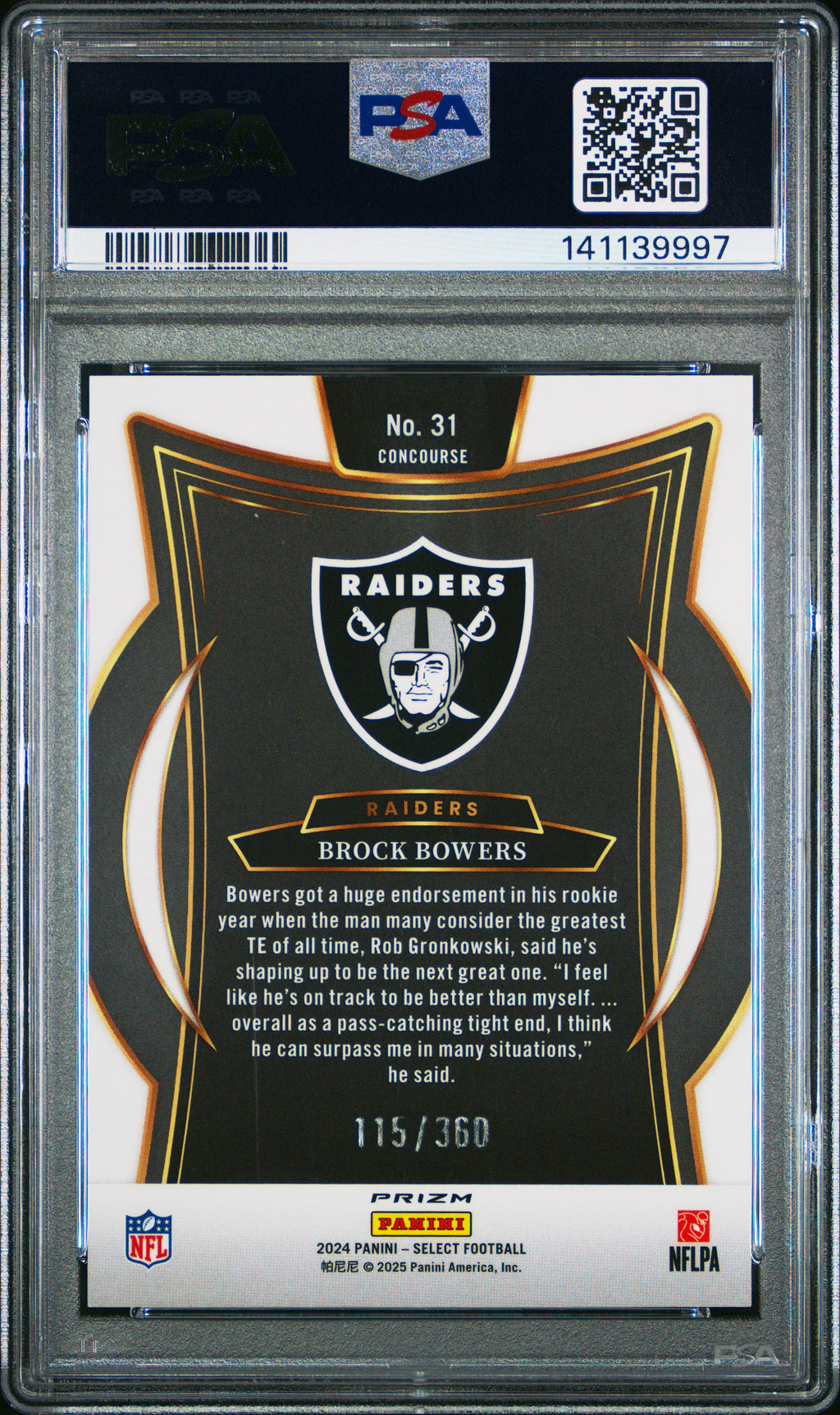 2024 Panini Select Brock Bowers Purple Shock Rookie 115/360 #31 PSA 9 MINT Los Angeles Raiders Don't miss your chance to own this stunning 2024 Panini Select Brock Bowers Purple Shock Rookie card, professionally graded PSA 9 MINT! This rare serial numbered card (#115/360) is a must-have for serious football collectors and Raiders fans, featuring one of the most exciting rookie prospects of the year. With only 7 total graded examples and just 3 graded higher, this card offers true investment potential and standout appeal for any collection. The eye-catching Purple Shock parallel, combined with its Rookie status and official PSA certification, makes this card a centerpiece for display or long-term value. Secure this limited edition collectible today and celebrate Brock Bowers’ debut season with the Los Angeles Raiders! Set: 2024 Panini Select Certification Number: 141139997 Grader: Professional Sports Authenticator (PSA) Year Manufactured: 2024 Grade: 9 Player/Athlete: Brock Bowers Serial Number: 115/360 Graded: Yes Sport: Football Population Higher: 3 Parallel/Variety: Purple Shock Manufacturer: Panini Population: 7 Team: Los Angeles Raiders Features: Rookie, Serial Numbered Card Number: 31 Listed With Mascot.