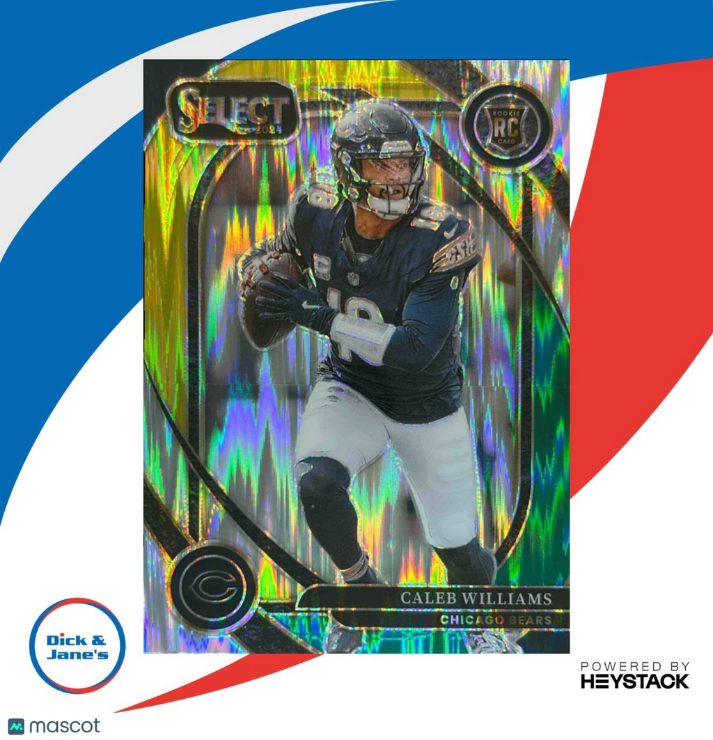 Get your hands on the highly sought-after 2024 Panini Select Caleb Williams Green and Yellow Prizm Shock #216 RC Bears trading card! This officially licensed NFL card features the rookie sensation Caleb Williams in a stunning green and yellow design. Add this rare collectible to your sports card collection today! Listed With Mascot.