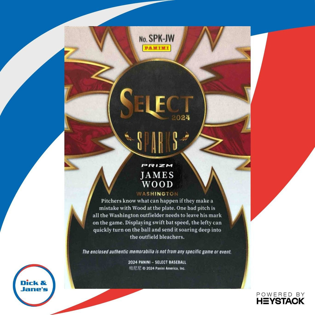 2024 Panini Select James Wood Sparks Relics #SPK-JW MEM features a game-worn jersey relic from rising star James Wood of the Washington Nationals. This MLB trading card is a must-have for collectors, showcasing a piece of baseball history in a sleek Panini Select design. Don't miss your chance to own a piece of the action! Listed With Mascot.