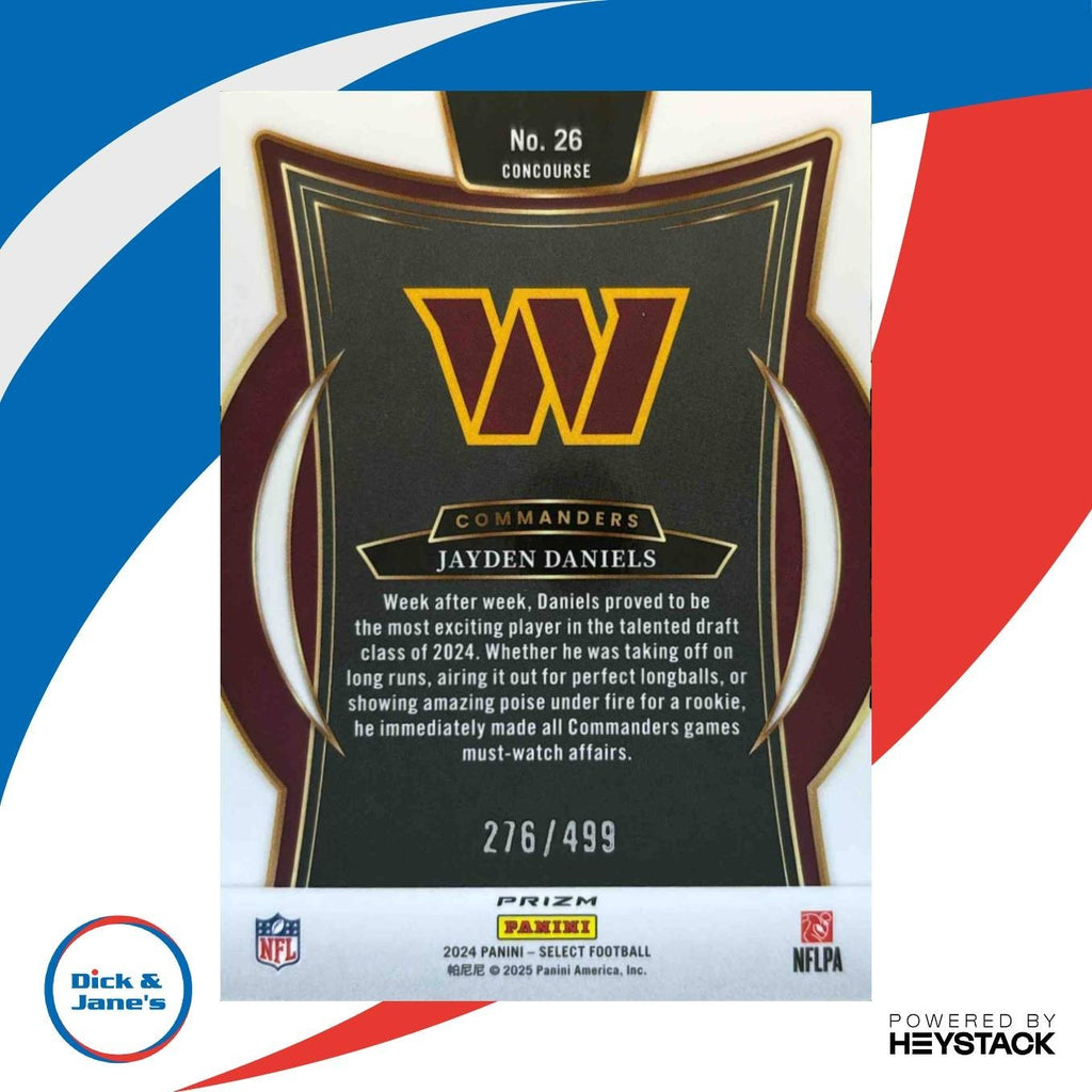 This 2024 Panini Select Jayden Daniels Orange Prizm Shock #26 RC Commanders trading card is a must-have for NFL fans and collectors. Limited to only 499 copies, this rookie card features a stunning design and is a rare find. Add this special card to your collection today! Listed With Mascot.