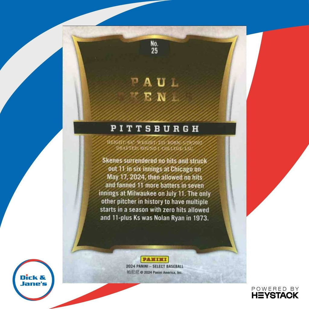 Get your hands on this exclusive 2024 Panini Select Paul Skenes Throwback #25 RC trading card featuring the Pittsburgh Pirates rookie. A must-have for any MLB collector, this rare card is a valuable addition to your collection. Don't miss out on owning a piece of baseball history! Listed With Mascot.