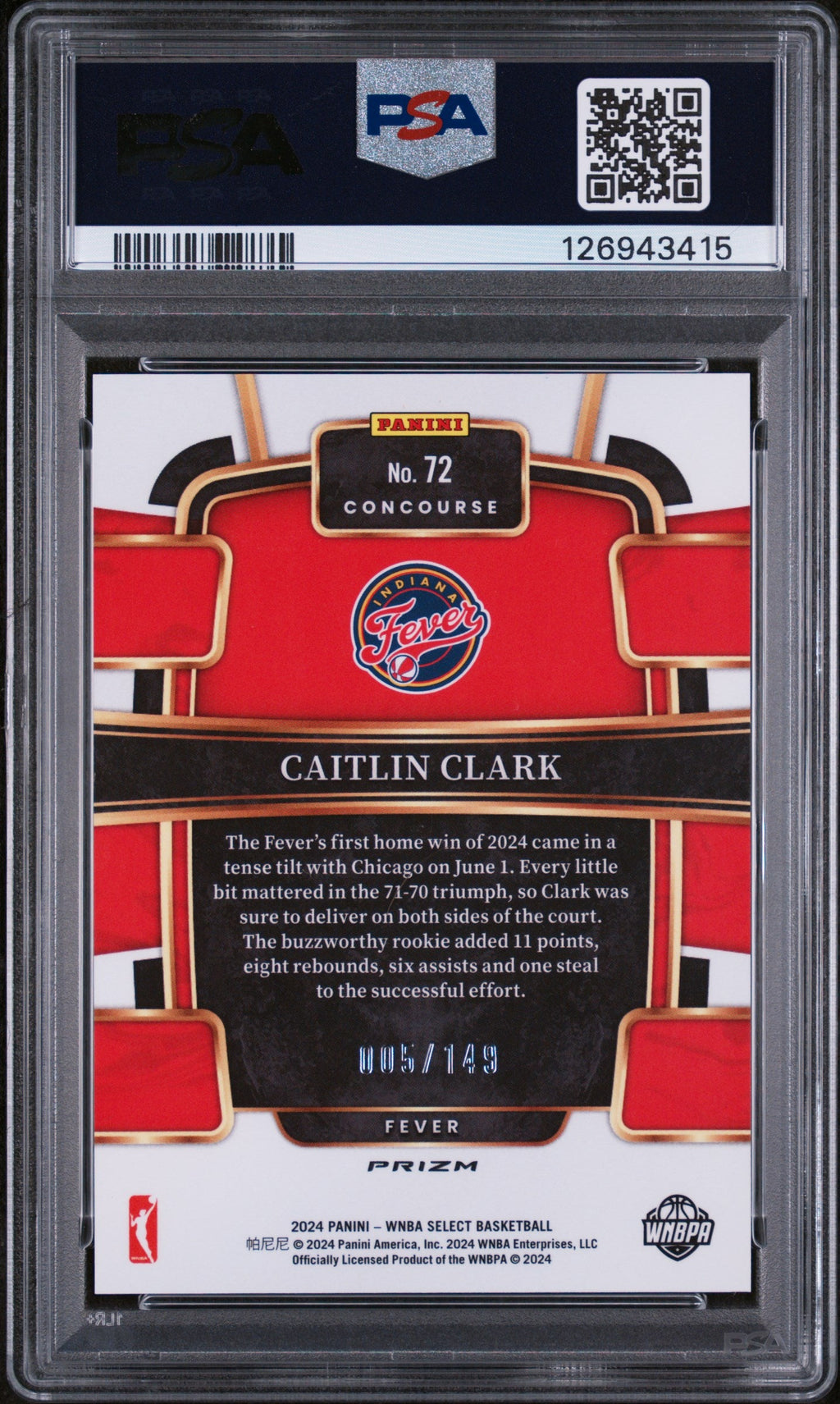 2024 Panini Select WNBA Caitlin Clark Purple Ice Rookie 005/149 #72 PSA 10 GEM Don't miss your chance to own this stunning 2024 Panini Select WNBA Caitlin Clark Purple Ice Rookie card, serial numbered 005/149 and professionally graded PSA 10 GEM MINT! This highly sought-after card features the breakout rookie sensation Caitlin Clark, making it a must-have for serious collectors and WNBA fans. With only 40 cards graded and none higher, this is a true investment piece that stands out in any collection. Secure this rare Purple Ice parallel before it's gone—graded by Professional Sports Authenticator with certification number 126943415. The card comes with all the top features collectors crave: rookie status, serial numbering, and pristine condition. Add this exclusive Caitlin Clark rookie to your collection today and celebrate one of basketball’s brightest new stars! Set: 2024 Panini Select WNBA Certification Number: 126943415 Grader: Professional Sports Authenticator (PSA) Grade: 10 Year Manufactured: 2024 Player/Athlete: Caitlin Clark Serial Number: 005/149 Graded: Yes Population Higher: 0 Sport: Basketball Parallel/Variety: Purple Ice Manufacturer: Panini Population: 40 Features: Rookie, Serial Numbered Card Number: 72 Listed With Mascot.