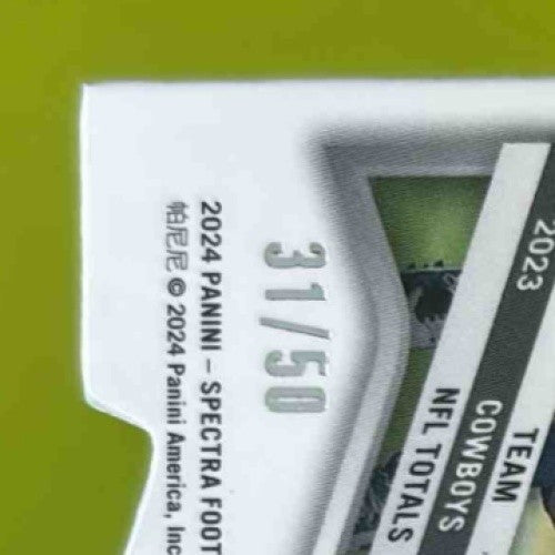 The 2024 Panini Spectra Micah Parsons Neon Blue Die-Cut 31/50 #34 Dallas Cowboys trading card is a rare and highly sought-after collectible featuring the star linebacker. Limited to only 50 copies, this card showcases Parsons in action with the iconic Cowboys team colors. A must-have for any NFL collector! Listed With Mascot.