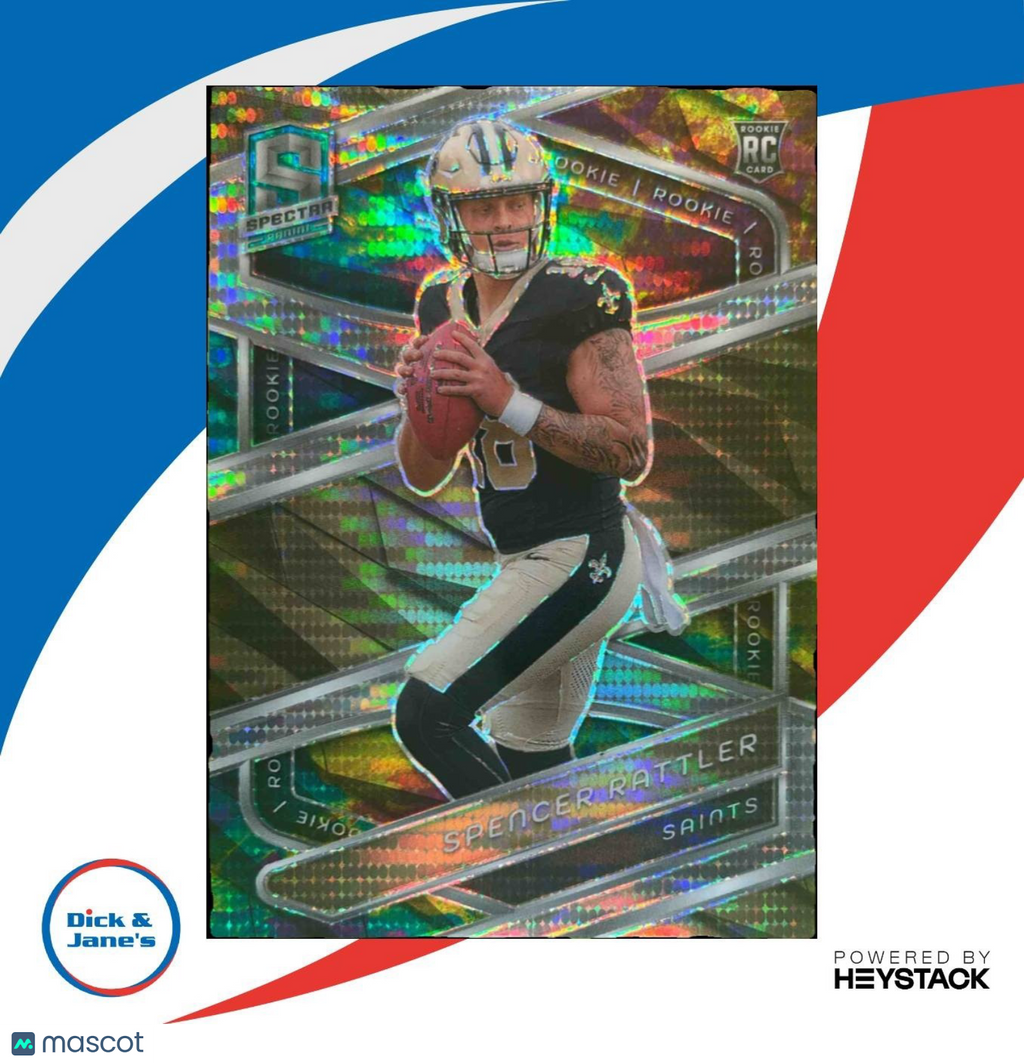 Capture the future of the NFL with this rare 2024 Panini Spectra Spencer Rattler Celestial trading card. Limited to just 99 copies, this rookie card (#153) features the star quarterback in his New Orleans Saints uniform. A must-have for any football card collector! Listed With Mascot.