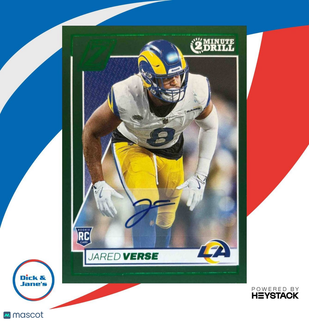 This 2024 Panini Zenith Jared Verse Rookie Auto Two Minute Drill #142 RC Rams trading card is a must-have for NFL collectors! Featuring a rare autograph from the rookie, this card showcases his skill and potential on the field. Don't miss out on adding this valuable piece to your collection! Listed With Mascot.