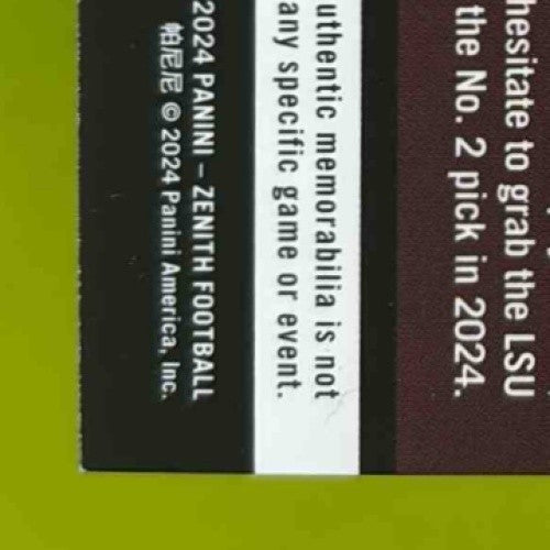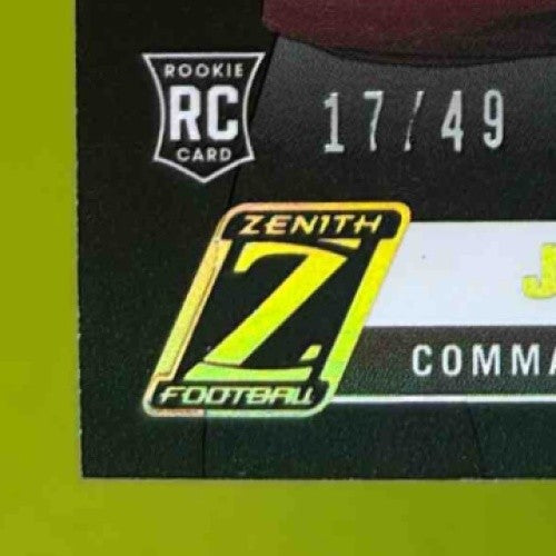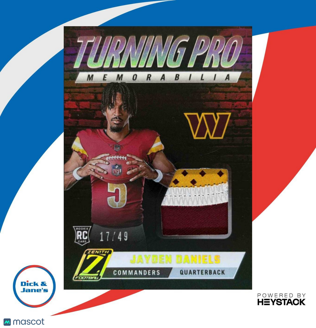 : This rare and highly sought-after 2024 Panini Zenith Jayden Daniels Turning Pro Memorabilia Prime sports trading card features a piece of game-worn jersey from the rising star quarterback. Limited to only 49 copies, this card is numbered 17/49 and is a must-have for any collector or fan of Jayden Daniels. Don't miss your chance to own a piece of sports history! Listed With Mascot.