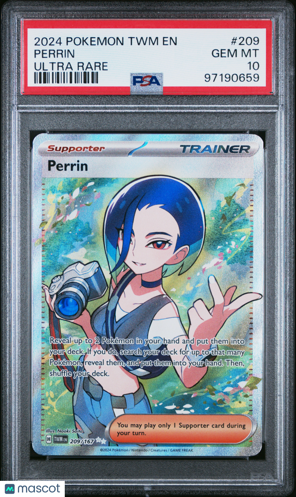 You are purchasing a 2024 Pokemon TWM EN-Twilight Masquerade Perrin #209 Ultra Rare PSA 10. You will receive the exact item in the photographs. Thank you for looking. Listed With Mascot.