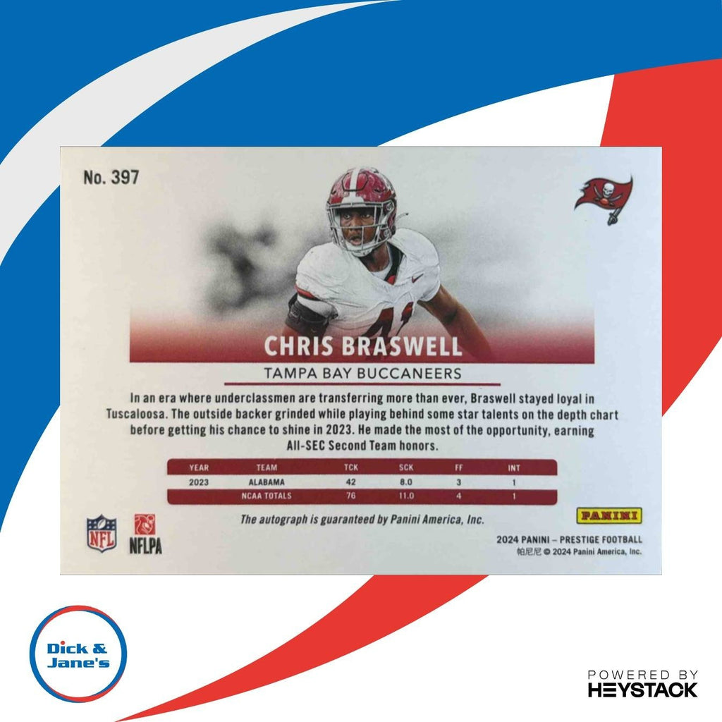 This 2024 Prestige Chris Braswell Xtra Points Signatures Gold /50 #397 Buccaneers trading card is a rare find for NFL fans. Featuring an authentic autograph from the player, this limited edition card is a must-have for collectors looking to add a unique piece to their collection. Don't miss your chance to own a piece of football history! Listed With Mascot.