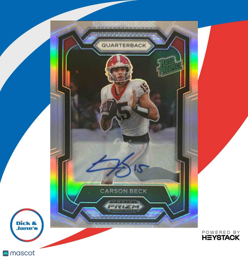 Get your hands on the 2024 Prizm Collegiate Draft Picks Carson Beck Auto #130 RC Georgia Bulldogs sports trading card! This NCAAF card features a rookie autograph of the standout Georgia Bulldogs quarterback. A must-have for any sports card collector or fan of college football. Listed With Mascot.