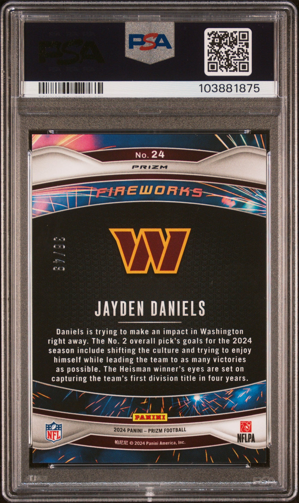 You are purchasing the following: 2024 Panini Prizm Fireworks Jayden Daniels Purple Power 38/49 #24 PSA 10 Washington Commanders. You will receive the exact item in the photographs. Note: Please do not connact us and asking the following: 1. What is the lowest you would take? Just make an offer. If the offer is automatically declined, you have your answer. 2. What the best you can do? See above. Not repling to an email is a reply. 3. Any room on this? See above. Not repling to an offer is a reply. 4. We ONLY do one counter offer, so please make your best offer the first time! Note: If the price off, in your option, please send your resaoning and an offer. We will review it. Note: We manage nearly 10 millon cards regularly and will adjust prices as errors are noticed or pointed out! Listed With Mascot.