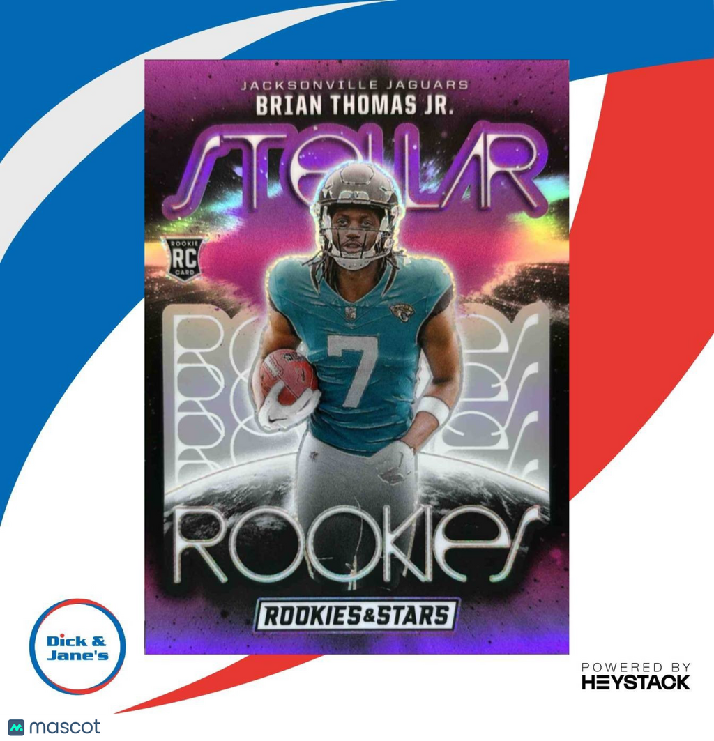 Add this ultra-rare 2024 Rookies & Stars Brian Thomas Jr. Stellar Purple /35 Jaguars trading card to your collection! This NFL rookie card features an exclusive design and limited edition numbering, making it a must-have for any football enthusiast. Don't miss out on owning a piece of sports history - place your bid today! #NFL #TradingCard #Collectible Listed With Mascot.