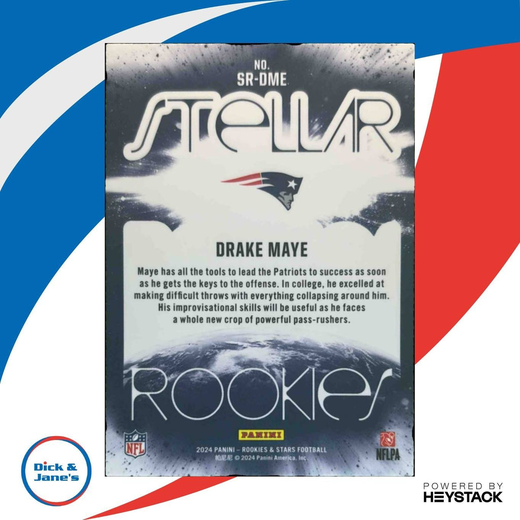 Collect the highly sought-after 2024 Rookies & Stars Drake Maye Stellar s Red Plaid RC card featuring the rising star quarterback for the New England Patriots. This rookie card captures Maye's stellar performance on the field with a stunning red plaid design. A must-have for any NFL trading card collector! Listed With Mascot.