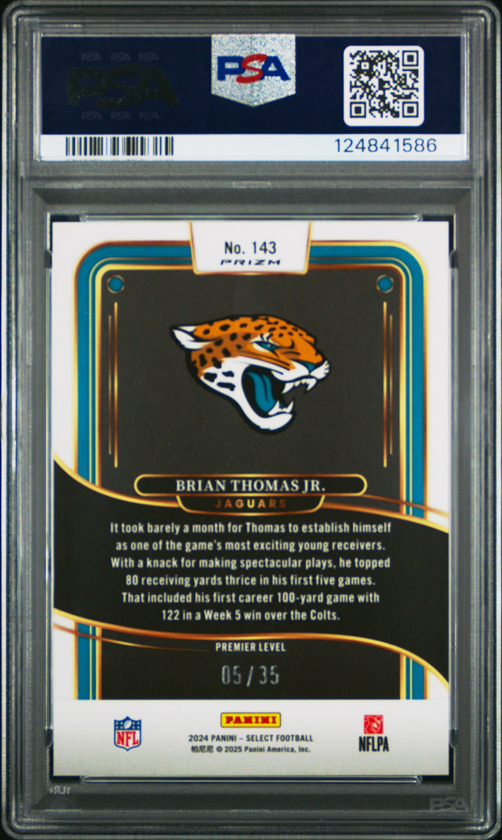 2024 Panini Select Brian Thomas JR. White Prizm 05/35 Rookie #143 PSA 10 Jacksonville Jaguars Don't miss your chance to own this rare 2024 Panini Select Brian Thomas JR. White Prizm Rookie card, serial numbered 05/35 and professionally graded PSA 10—none graded higher! This stunning card features the standout Jacksonville Jaguars rookie and showcases the highly sought-after White Prizm parallel, making it a must-have for serious collectors and fans alike. With only 10 in the population and zero graded higher, this card is a true gem for any football card collection. Secure this investment piece today and celebrate Brian Thomas JR.'s rookie season with a card that stands out for its rarity, pristine condition, and eye-catching design! Set: 2024 Panini Select Certification Number: 124841586 Grader: Professional Sports Authenticator (PSA) Grade: 10 Year Manufactured: 2024 Player/Athlete: Brian Thomas JR. Serial Number: 05/35 Graded: Yes Sport: Football Population Higher: 0 Parallel/Variety: White Prizm Manufacturer: Panini Population: 10 Team: Jacksonville Jaguars Features: Rookie, Serial Numbered Card Number: 143 Listed With Mascot.