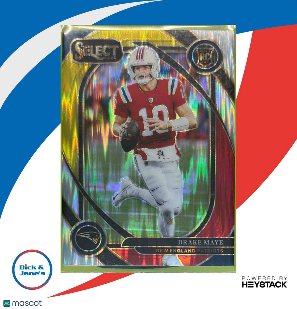 2024 Select Drake Maye Club Red and Yellow Prizm Shock #218 RC Patriots Listed With Mascot.