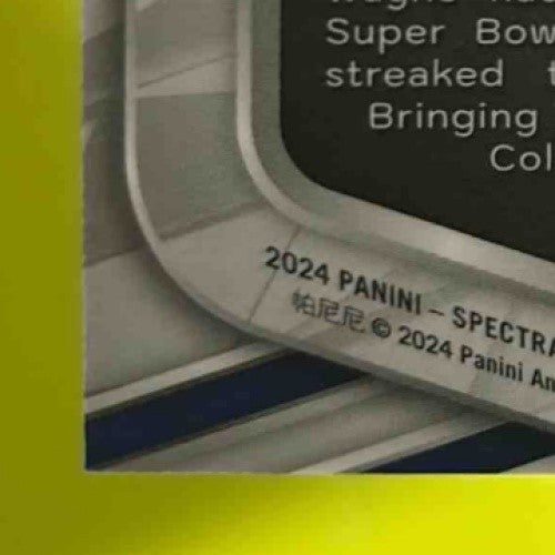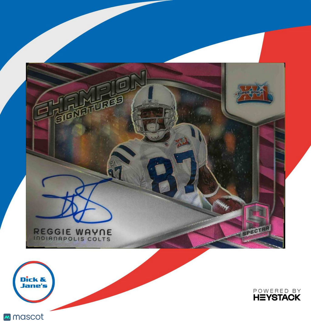 This 2024 Spectra Reggie Wayne NFL trading card features a rare Champion Signatures Neon Pink autograph with only 15 in existence. Celebrating Wayne's Super Bowl XLI victory with the Colts, this limited edition card is a must-have for any football collector. Listed With Mascot.
