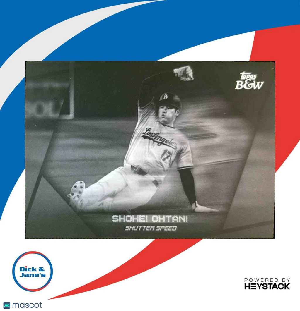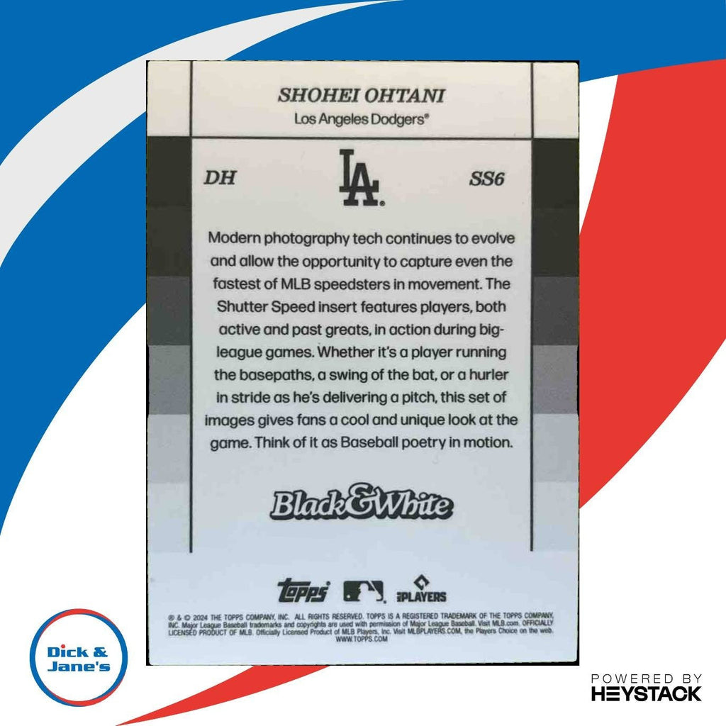 Rare 2024 Topps Black & White Shohei Ohtani Shutter Speed #SS6 trading card featuring the Los Angeles Dodgers pitcher. Limited edition MLB collectible card showcasing Ohtani's athleticism and style. A must-have for any baseball card collector or fan of the game. Don't miss your chance to own this unique and valuable piece of sports memorabilia. Listed With Mascot.