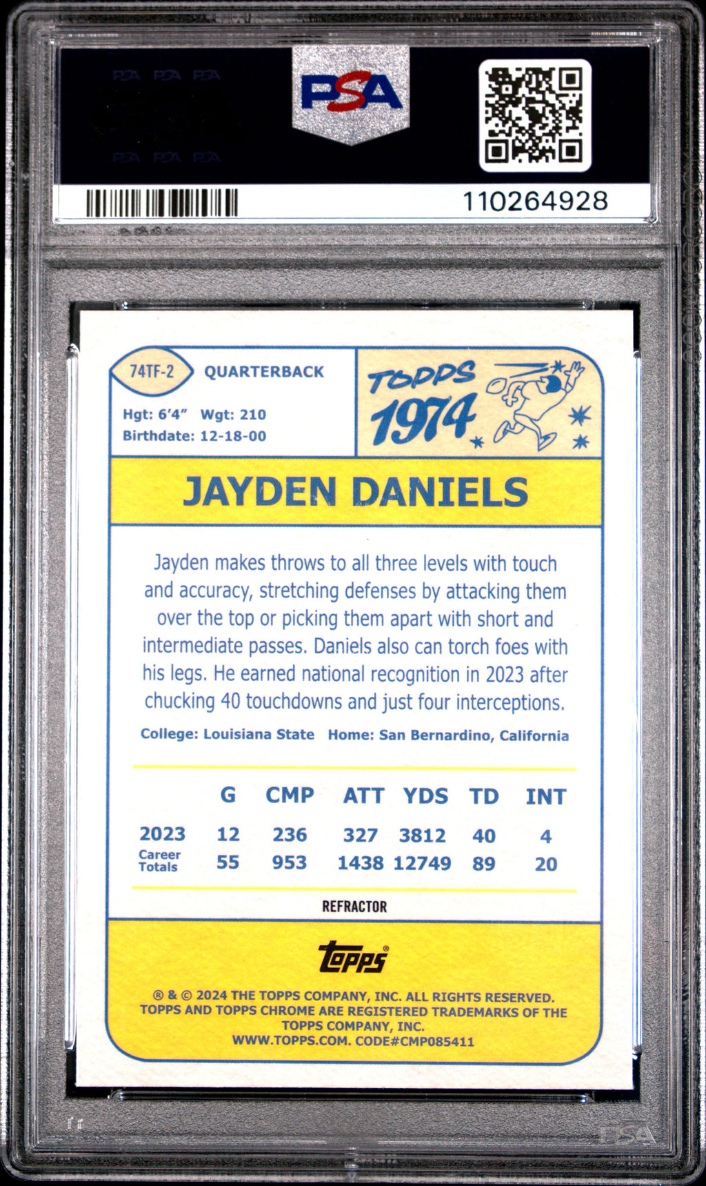 2024 Topps Chrome 1974 Topps Football Jayden Daniels Refractor Rookie PSA 9 Don’t miss your chance to own this stunning 2024 Topps Chrome 1974 Topps Football Jayden Daniels Refractor Rookie, professionally graded PSA 9! This highly sought-after card features the dynamic rookie Jayden Daniels and stands out with its brilliant refractor finish—an absolute must-have for any serious football card collector or Jayden Daniels fan. With only 103 graded in this population and just 61 graded higher, this card represents a rare opportunity to add a top-tier rookie to your collection. Authenticated by PSA and featuring the coveted rookie designation, this collectible is ready to ship and sure to impress. Secure this investment piece today before it’s gone! Set: 2024 Topps Chrome 1974 Topps Football Certification Number: 110264928 Grader: Professional Sports Authenticator (PSA) Year Manufactured: 2024 Grade: 9 Player/Athlete: Jayden Daniels Graded: Yes Population Higher: 61 Sport: Football Parallel/Variety: Ref Manufacturer: Topps Population: 103 Features: Rookie Card Number: 74TF2 Listed With Mascot.