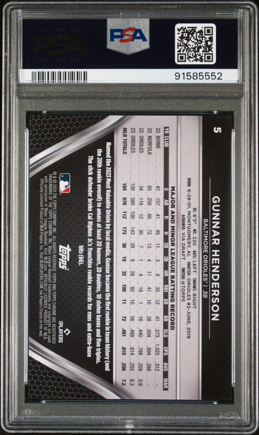 You are purchasing the following: 2024 Topps Chrome Black Gunnar Henderson Gold Refractor 13/50 #5 PSA 10 Baltimore Orioles. You will receive the exact item in the photographs. Note: Please do not connact us and asking the following: 1. What is the lowest you would take? Just make an offer. If the offer is automatically declined, you have your answer. 2. What the best you can do? See above. Not repling to an email is a reply. 3. Any room on this? See above. Not repling to an offer is a reply. 4. We ONLY do one counter offer, so please make your best offer the first time! Note: If the price off, in your option, please send your resaoning and an offer. We will review it. Note: We manage nearly 10 millon cards regularly and will adjust prices as errors are noticed or pointed out! Listed With Mascot.