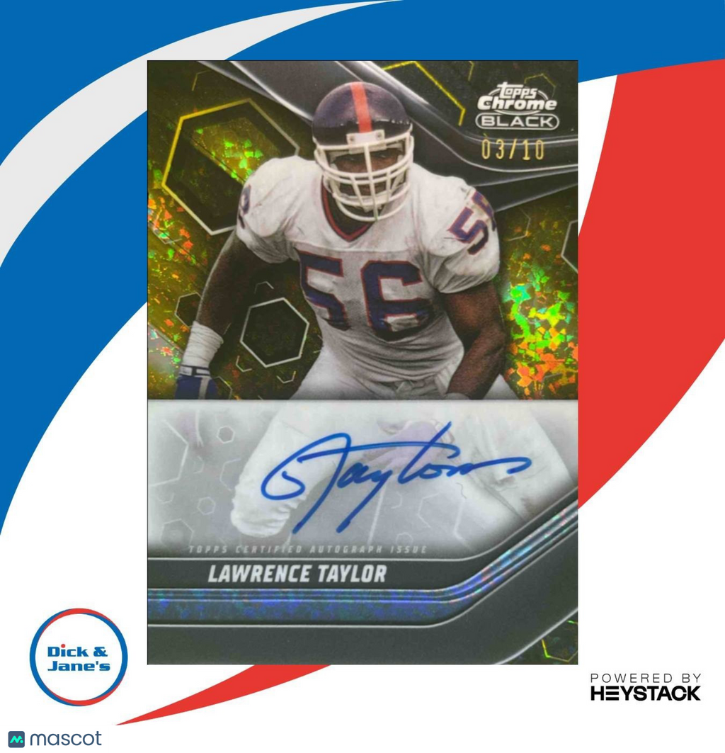 This rare 2024 Topps Chrome Black Lawrence Taylor Auto /10 Giants trading card features a hand-signed autograph by the legendary NFL player. Limited to only 10 copies, this highly sought-after collectible is a must-have for any football fan or trading card enthusiast. Don't miss your chance to own a piece of history with this exclusive Lawrence Taylor card. Listed With Mascot.