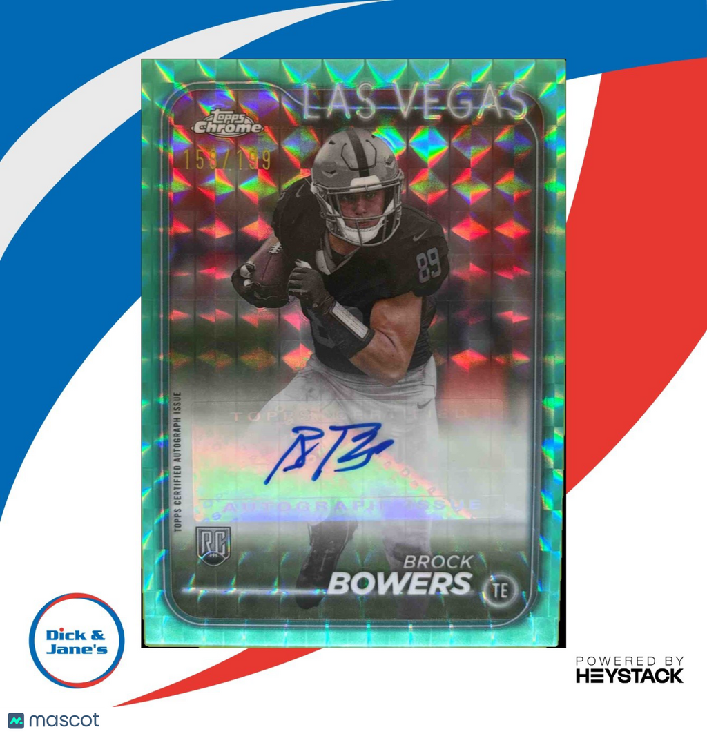 Powered by Frooition Home About Us Contact Other Baseball Baseball Rookies Baseball Inserts Baseball Game Used/Relics Baseball Autographed Football Football Rookies Football Inserts Football Game Used/Relics Football Autographed Basketball Basketball Rookies Basketball Inserts Basketball Game Used/Relics Basketball Autographed Hockey NASCAR Hard Cover Books Music CDs Baseball Boxes Baseball Pack Lots Football Boxes Football Pack Lots Other Boxes Othe Pack Lots Magic Singles 2024 Topps Chrome Brock Bowers Rookie Auto Aqua Geometric Refractor 158/199 RC 2024 Topps Chrome Brock Bowers Rookie Auto Aqua Geometric Refractor 158/199 RC Item Description Get your hands on the exclusive 2024 Topps Chrome Brock Bowers Rookie Auto Aqua Geometric Refractor trading card! This limited edition NFL card features an authentic autograph from the rising star and is numbered 158 out of 199. Don't miss out on this unique piece for your collection. About Us About Us PSA Grading Consignments Buying Cards EBay Live About Us Yes, there was a Dick & Jane! Originally founded in 1989, Dick & Jane's is Jacksonville's oldest hobby and collectibles store. Our focus is on the collector. We started small with comics, coins and cards and evolved based upon our customers needs and desired and now have 14 employees and over 5 million sportscards and nearly 700,000 different items on our dedicated singles sportscard website We have thousands of raw TCG cards in store. Magic the Gathering and Pokemon! We have Jacksonville s largest selection of graded sports and non-sports cards, all accessible on our website! We engage with our customers! Let us know what you would like to see in the store or changes you would suggest that we make. We would like to start hosting MONTHLY TRADE NIGHTS! We always are buying and trading! WE ARE THE LOCAL HOBBY STORE!!! Stop by if you are in the Jacksonville Area! We are right off I-95 near downtown. PSA Grading PSA Grading We