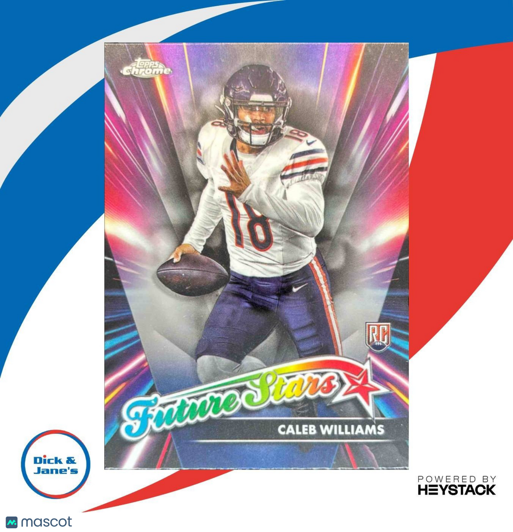 Check out this rare 2024 Topps Chrome Caleb Williams Future Stars #FS-1 RC trading card featuring the Chicago Bears! This rookie card is a must-have for any NFL card collector. Get your hands on this highly sought-after card before it's gone! Listed With Mascot.