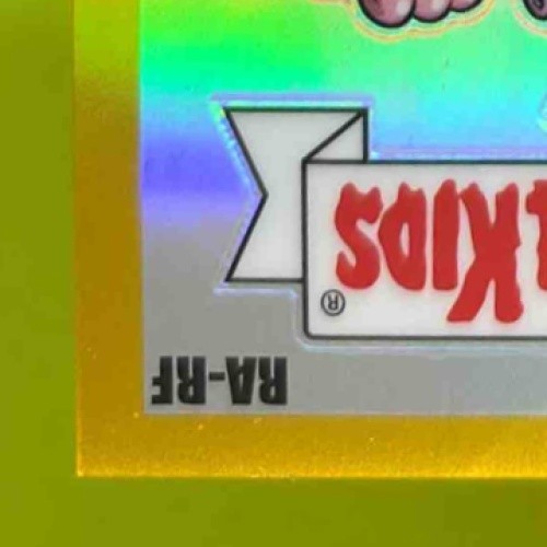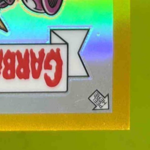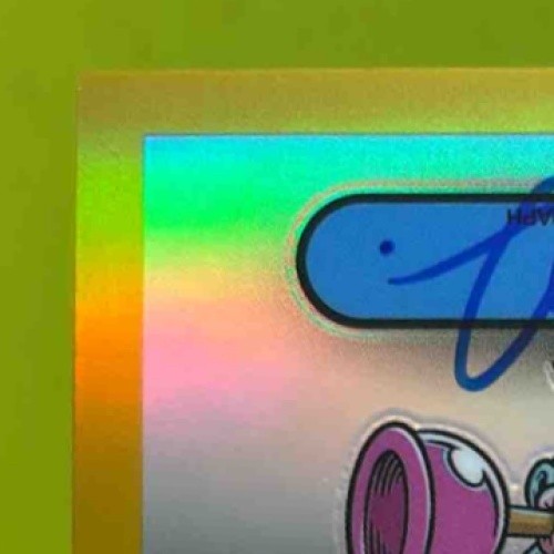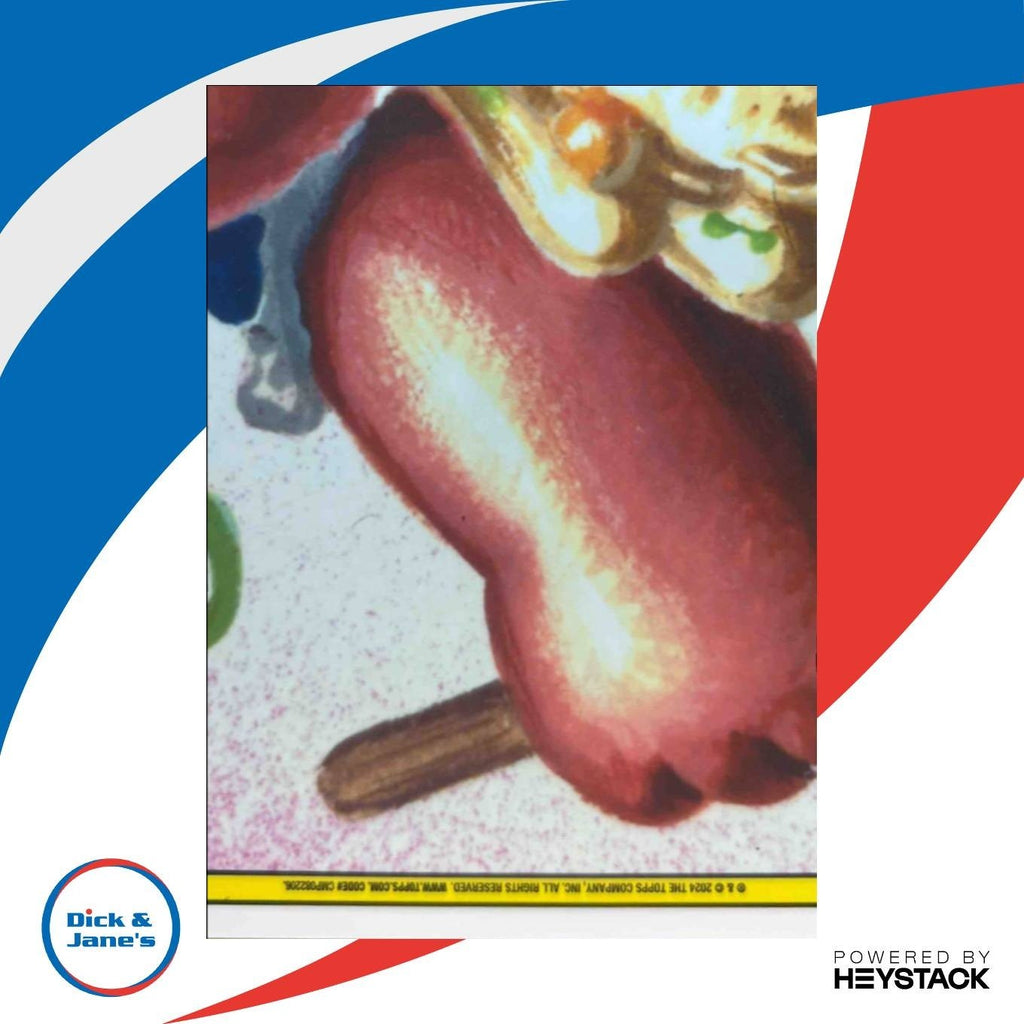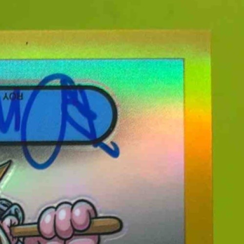 This 2024 Topps Chrome Garbage Pail Kids 7 ROY L. Flush card features a unique, one-of-a-kind design by artist Rory. Limited edition autographed card with a gold finish, numbered out of 50. A must-have for any collector looking for a rare and special addition to their collection. Listed With Mascot.