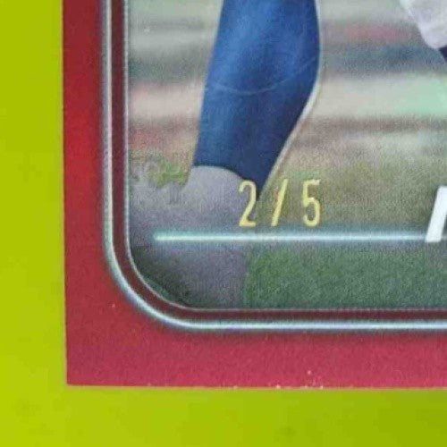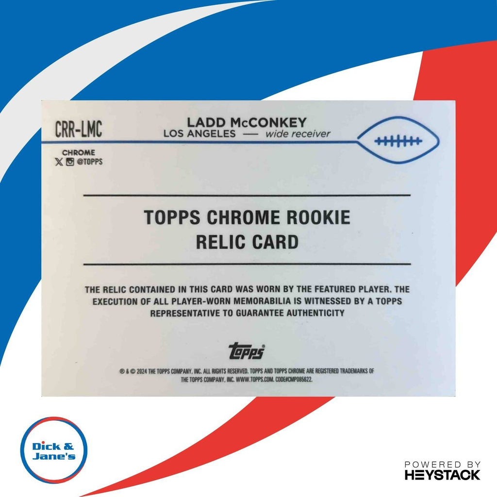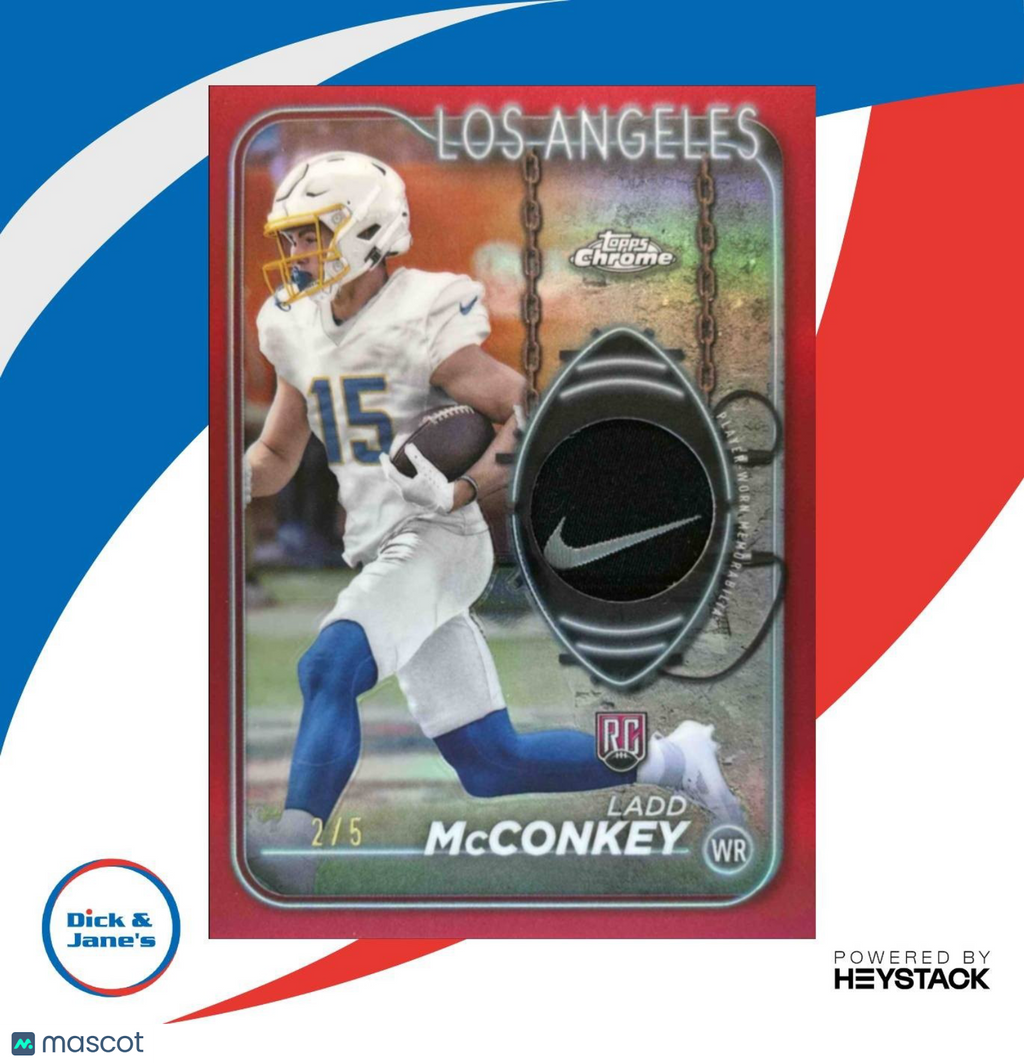 Own a piece of NFL history with this exclusive 2024 Topps Chrome Ladd McConkey Rookie Relics Red Refractor trading card. Limited to only 5 made, this card features a game-worn SWOOSH patch from McConkey's time with the Chargers. Don't miss out on adding this rare MEM RC card to your collection! Listed With Mascot.