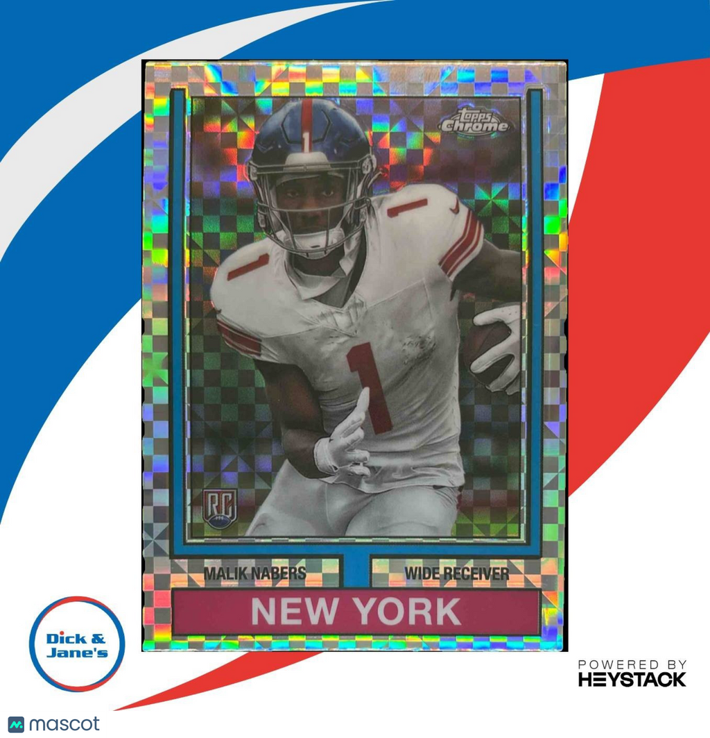 The 2024 Topps Chrome Malik Nabers 1974 Football X-Fractor RC card features the exciting rookie wide receiver from the New York Giants. This rare and collectible card is a must-have for any football card collector, showcasing Nabers in his debut season. Don't miss out on adding this valuable piece to your collection! Listed With Mascot.