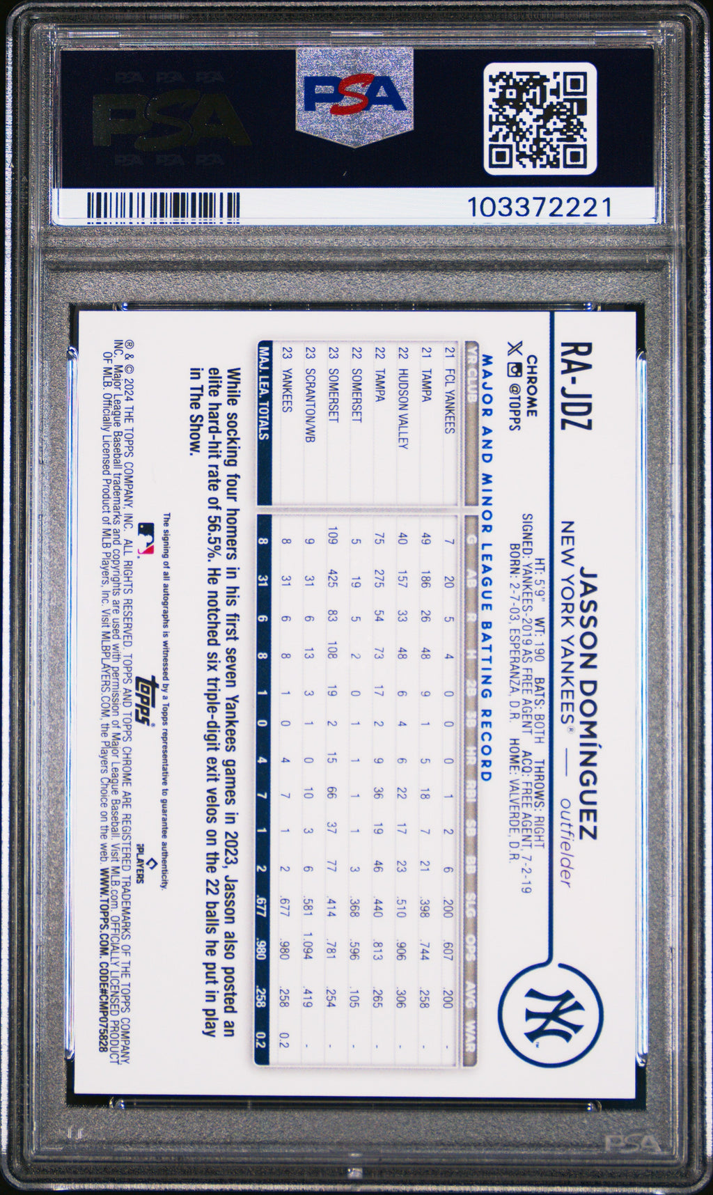 You are purchasing the following: 2024 Topps Chrome Rookie Autographs Jasson Dominguez Rookie #RAJDZ PSA 9 New York Yankees. You will receive the exact item in the photographs. Note: Please do not connact us and asking the following: 1. What is the lowest you would take? Just make an offer. If the offer is automatically declined, you have your answer. 2. What the best you can do? See above. Not repling to an email is a reply. 3. Any room on this? See above. Not repling to an offer is a reply. 4. We ONLY do one counter offer, so please make your best offer the first time! Note: If the price off, in your option, please send your resaoning and an offer. We will review it. Note: We manage nearly 10 millon cards regularly and will adjust prices as errors are noticed or pointed out! Listed With Mascot.