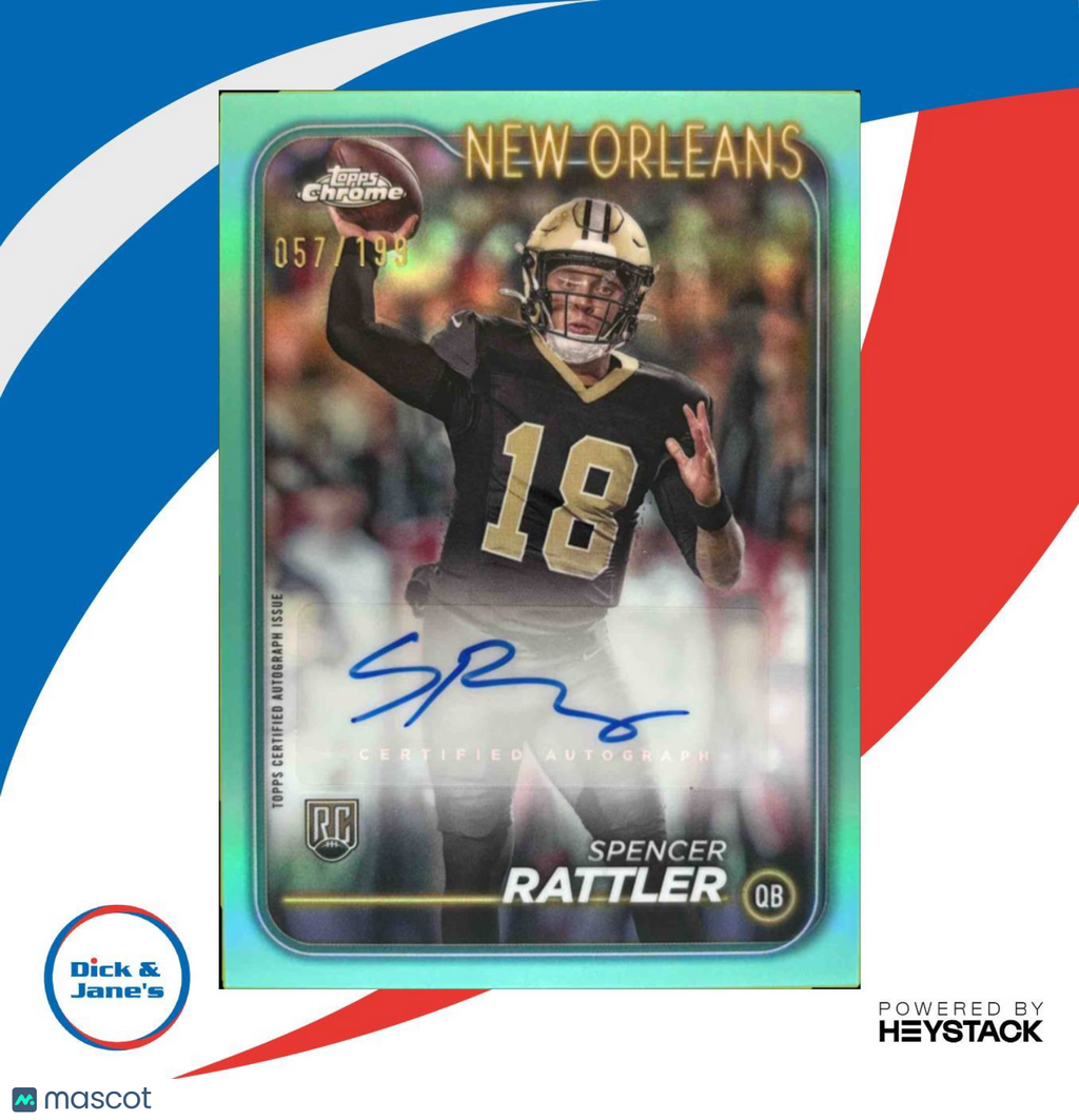 2024 Topps Chrome Spencer Rattler Rookie Auto Aqua Refractor /199 RC New Orleans Listed With Mascot.