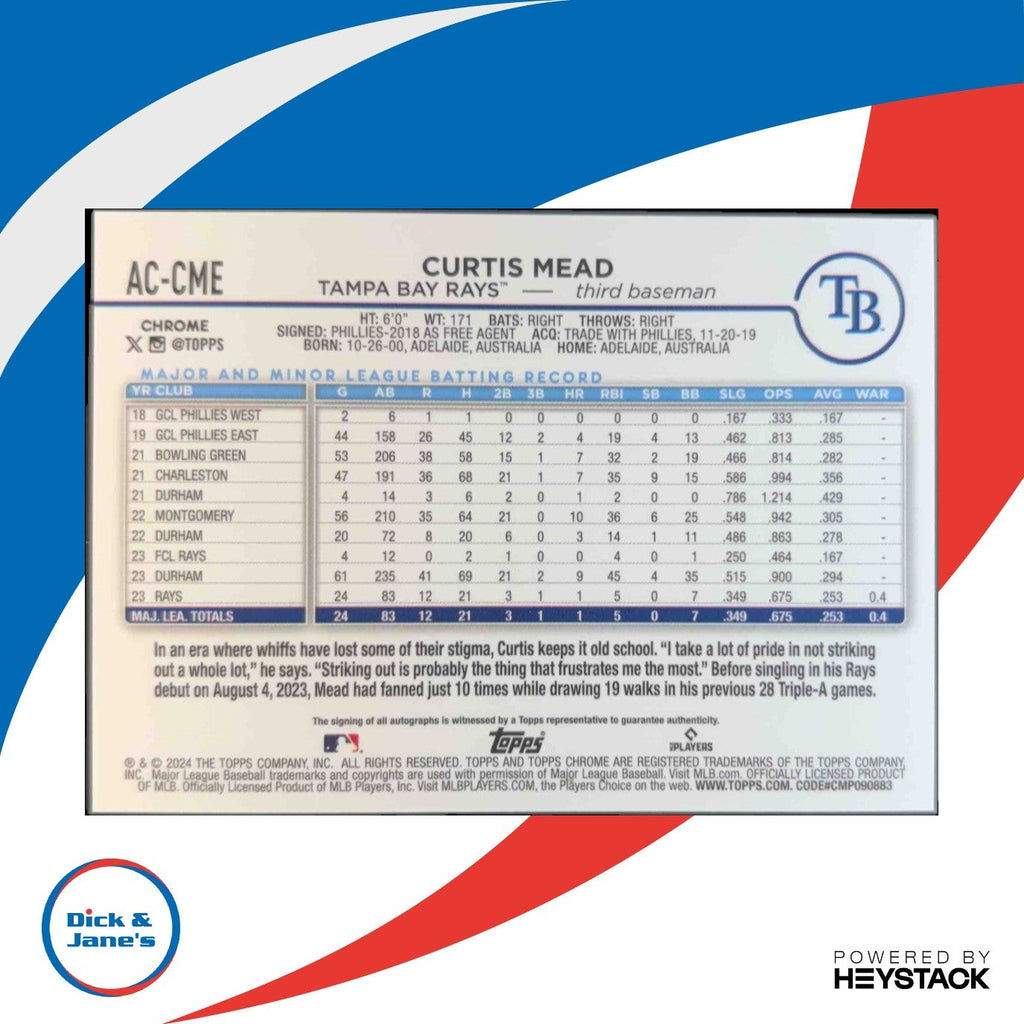 Powered by Frooition Home About Us Contact Other Baseball Baseball Rookies Baseball Inserts Baseball Game Used/Relics Baseball Autographed Football Football Rookies Football Inserts Football Game Used/Relics Football Autographed Basketball Basketball Rookies Basketball Inserts Basketball Game Used/Relics Basketball Autographed Hockey NASCAR Hard Cover Books Music CDs Baseball Boxes Baseball Pack Lots Football Boxes Football Pack Lots Other Boxes Othe Pack Lots Magic Singles 2024 Topps Chrome Update Curtis Mead Auto Black and White Mini-Diamond Refractor 2024 Topps Chrome Update Curtis Mead Auto Black and White Mini-Diamond Refractor Item Description The 2024 Topps Chrome Update Curtis Mead Auto Black and White Mini-Diamond Refractor is a rare MLB trading card featuring an autograph from the rookie sensation. This highly collectible card showcases Mead in stunning black and white with a unique diamond refractor finish. A must-have for any baseball card collector! About Us About Us PSA Grading Consignments Buying Cards EBay Live About Us Yes, there was a Dick & Jane! Originally founded in 1989, Dick & Jane's is Jacksonville's oldest hobby and collectibles store. Our focus is on the collector. We started small with comics, coins and cards and evolved based upon our customers needs and desired and now have 14 employees and over 5 million sportscards and nearly 700,000 different items on our dedicated singles sportscard website We have thousands of raw TCG cards in store. Magic the Gathering and Pokemon! We have Jacksonville s largest selection of graded sports and non-sports cards, all accessible on our website! We engage with our customers! Let us know what you would like to see in the store or changes you would suggest that we make. We would like to start hosting MONTHLY TRADE NIGHTS! We always are buying and trading! WE ARE THE LOCAL HOBBY STORE!!! Stop by if you are in the Jacksonville Area! We are right off I-95 near downtown. PSA Grading PSA Grading We