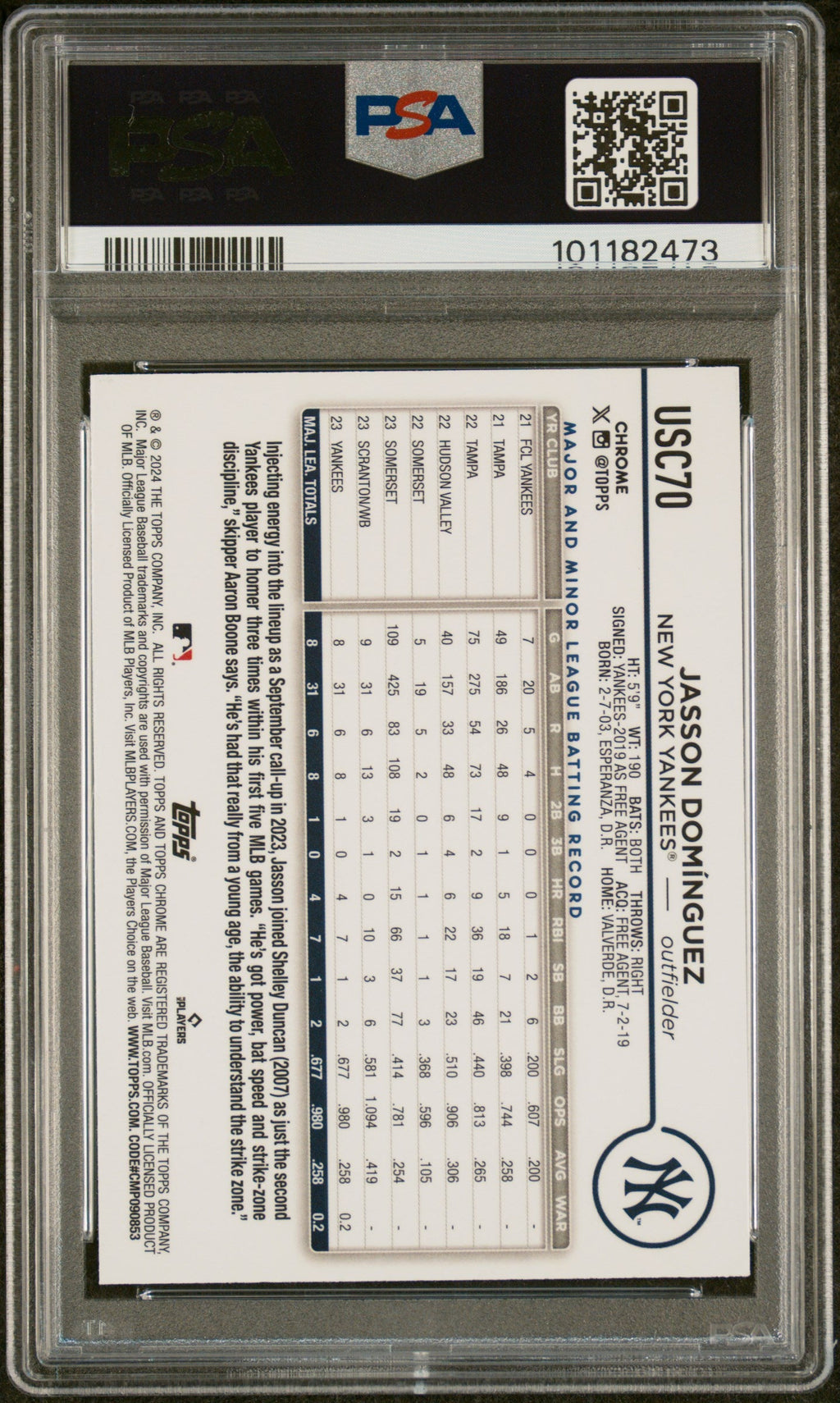 You are purchasing the following: 2024 Topps Chrome Update Jasson Dominguez SP Rookie #USC70 PSA 9 . You will receive the exact item in the photographs. Note: Please do not connact us and asking the following: 1. What is the lowest you would take? Just make an offer. If the offer is automatically declined, you have your answer. 2. What the best you can do? See above. Not repling to an email is a reply. 3. Any room on this? See above. Not repling to an offer is a reply. 4. We ONLY do one counter offer, so please make your best offer the first time! Note: If the price off, in your option, please send your resaoning and an offer. We will review it. Note: We manage nearly 10 millon cards regularly and will adjust prices as errors are noticed or pointed out! Listed With Mascot.