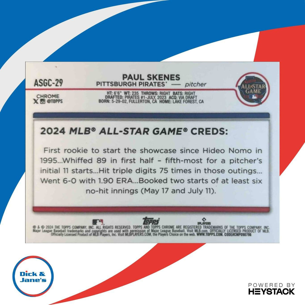 This 2024 Topps Chrome Update Paul Skenes All-Star Game RC card features the rising star from the Pittsburgh Pirates. A must-have for any baseball card collector, this rookie card captures an exciting moment in Skenes's career. Don't miss out on this limited edition MLB card! Grab yours now. Listed With Mascot.