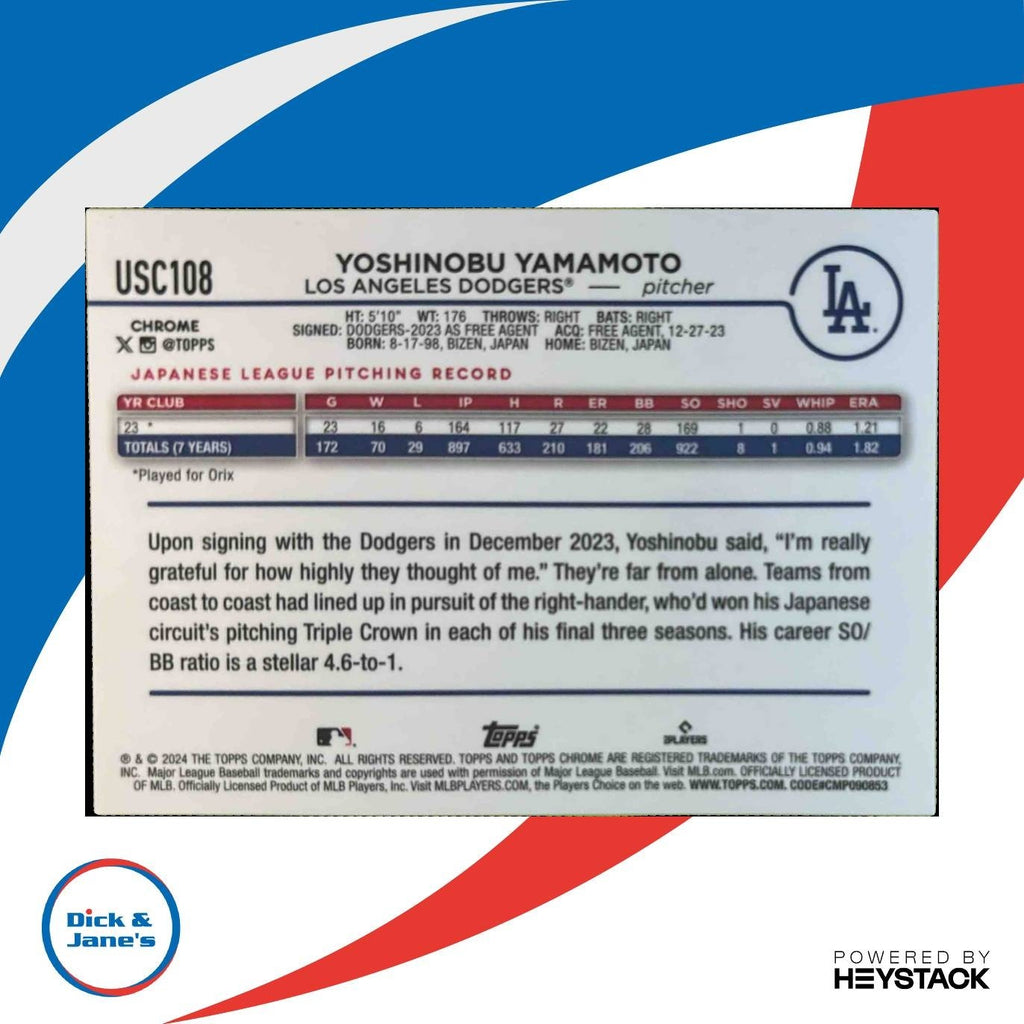 Own a piece of MLB history with this rare 2024 Topps Chrome Update Yoshinobu Yamamoto Variation Green Speckle RC card! Limited to only 99 copies, this is a must-have for any baseball card collector. Don't miss out on adding this unique card to your collection today! Listed With Mascot.