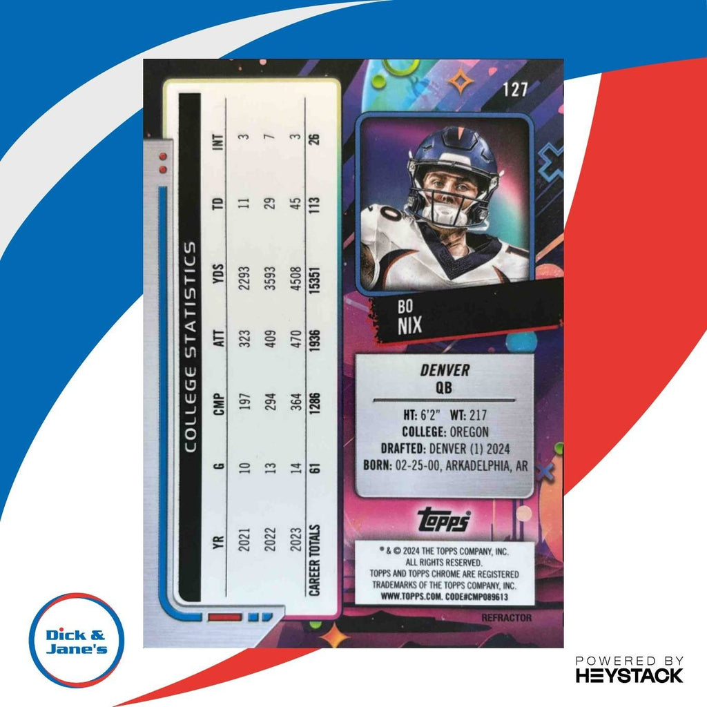 Rare 2024 Topps Cosmic Chrome Bo Nix Refractor #127 RC Denver Broncos sports trading card. This NFL rookie card features Bo Nix in a stunning refractor design. A must-have for any collector looking to add a unique and valuable piece to their collection. Get yours today! Listed With Mascot.