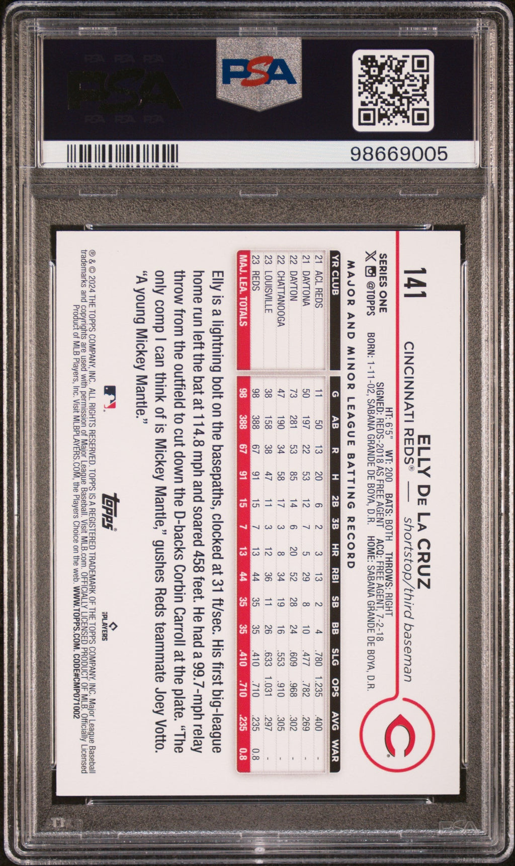 You are purchasing the following: 2024 Topps Elly De La Cruz Aqua Rookie #141 PSA 9 Cincinnati Reds. You will receive the exact item in the photographs. Note: Please do not connact us and asking the following: 1. What is the lowest you would take? Just make an offer. If the offer is automatically declined, you have your answer. 2. What the best you can do? See above. Not repling to an email is a reply. 3. Any room on this? See above. Not repling to an offer is a reply. 4. We ONLY do one counter offer, so please make your best offer the first time! Note: If the price off, in your option, please send your resaoning and an offer. We will review it. Note: We manage nearly 10 millon cards regularly and will adjust prices as errors are noticed or pointed out! Listed With Mascot.