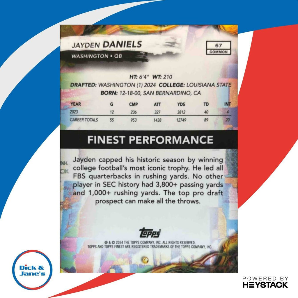 Collect the highly sought-after 2024 Topps Finest Jayden Daniels XRefractor #67 RC trading card featuring the talented quarterback for the Washington Commanders. This Common RC card showcases Daniels in action on the field and is a must-have for any NFL card collector. Don't miss your chance to add this gem to your collection! Listed With Mascot.