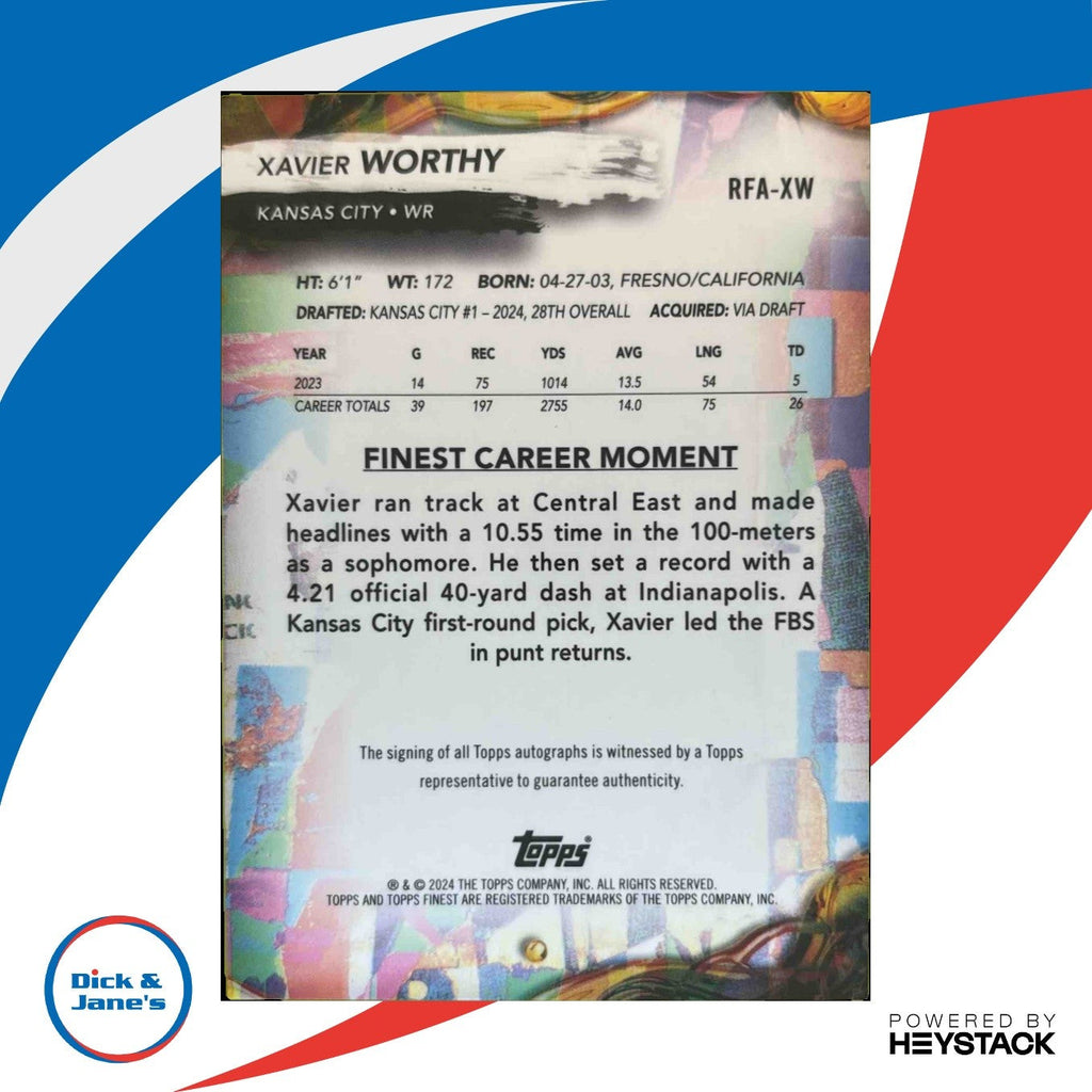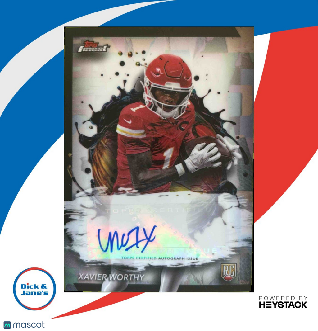 Powered by Frooition Home About Us Contact Other Baseball Baseball Rookies Baseball Inserts Baseball Game Used/Relics Baseball Autographed Football Football Rookies Football Inserts Football Game Used/Relics Football Autographed Basketball Basketball Rookies Basketball Inserts Basketball Game Used/Relics Basketball Autographed Hockey NASCAR Hard Cover Books Music CDs Baseball Boxes Baseball Pack Lots Football Boxes Football Pack Lots Other Boxes Othe Pack Lots Magic Singles 2024 Topps Finest Xavier Worthy Rookie Auto #RFA-XW RC Kansas City Chiefs 2024 Topps Finest Xavier Worthy Rookie Auto #RFA-XW RC Kansas City Chiefs Item Description This 2024 Topps Finest Xavier Worthy Rookie Autograph trading card features the rising star from the Kansas City Chiefs. Known for his impressive skills and potential, this card is a must-have for any NFL collector. Don't miss out on adding this rare RC Auto card to your collection. About Us About Us PSA Grading Consignments Buying Cards EBay Live About Us Yes, there was a Dick & Jane! Originally founded in 1989, Dick & Jane's is Jacksonville's oldest hobby and collectibles store. Our focus is on the collector. We started small with comics, coins and cards and evolved based upon our customers needs and desired and now have 14 employees and over 5 million sportscards and nearly 700,000 different items on our dedicated singles sportscard website We have thousands of raw TCG cards in store. Magic the Gathering and Pokemon! We have Jacksonville s largest selection of graded sports and non-sports cards, all accessible on our website! We engage with our customers! Let us know what you would like to see in the store or changes you would suggest that we make. We would like to start hosting MONTHLY TRADE NIGHTS! We always are buying and trading! WE ARE THE LOCAL HOBBY STORE!!! Stop by if you are in the Jacksonville Area! We are right off I-95 near downtown. PSA Grading PSA Grading We
