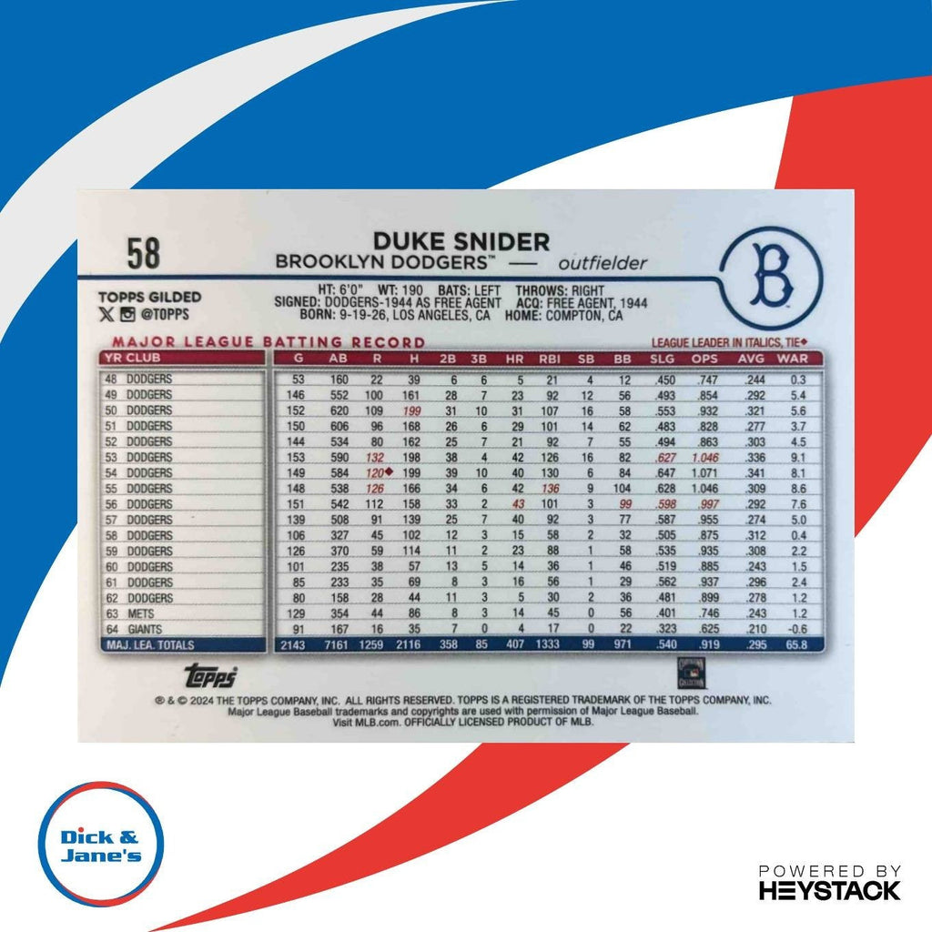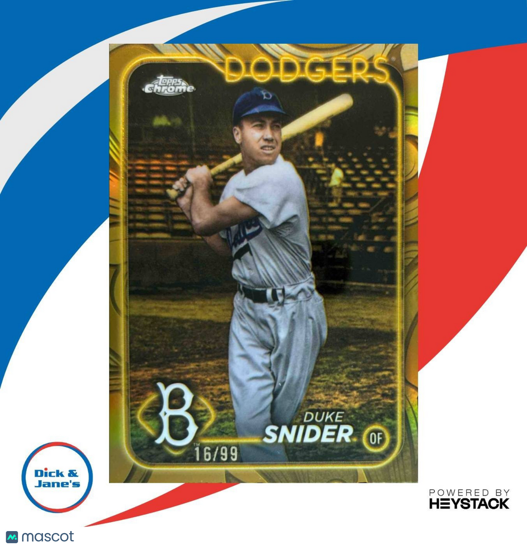 This rare 2024 Topps Gilded Collection Duke Snider trading card is a must-have for any Brooklyn Dodgers or MLB fan. Limited to only 99 copies worldwide, this card features a stunning gold gilded design and is numbered 16/99. Add this iconic piece to your collection today and own a piece of baseball history. Listed With Mascot.