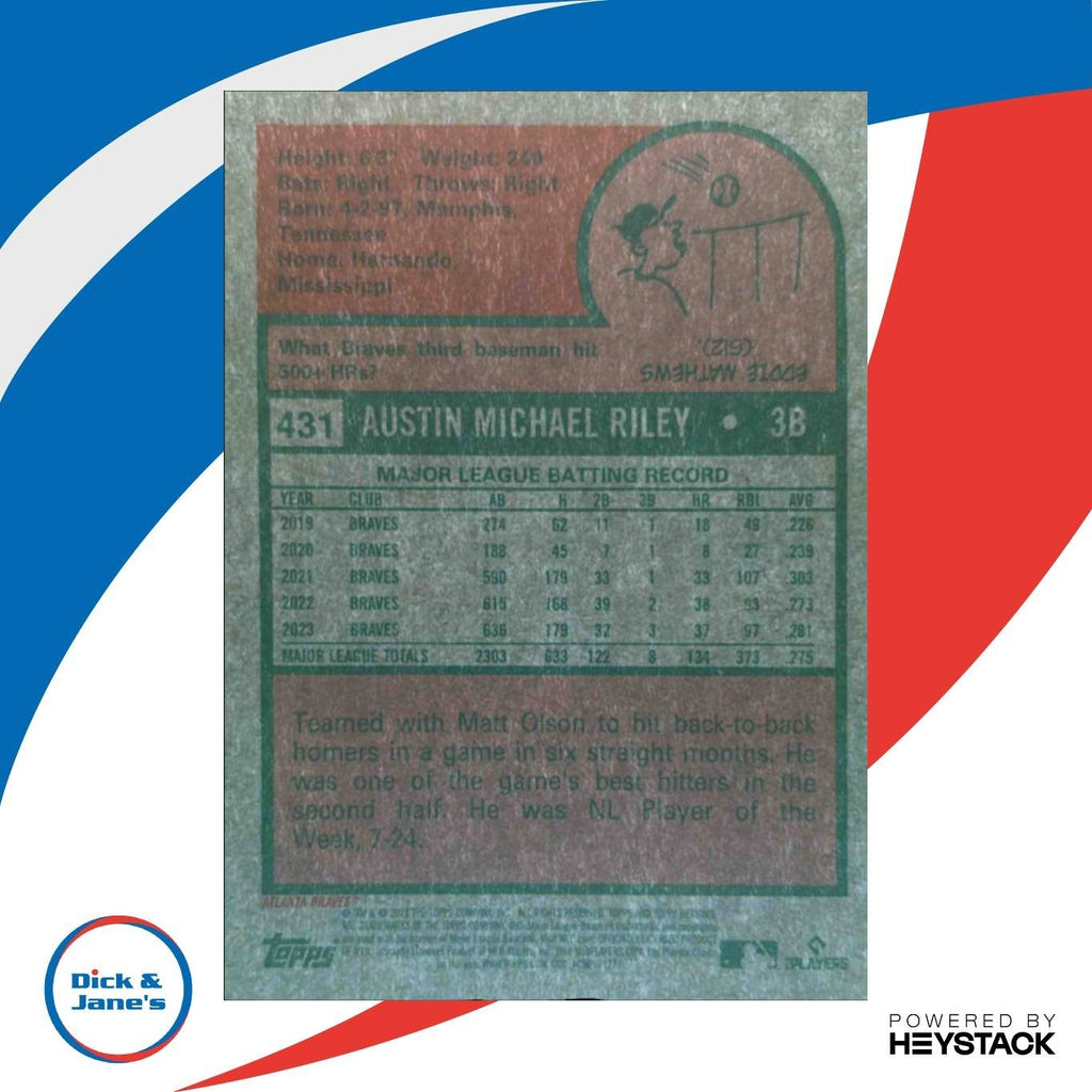 Own a piece of baseball history with the 2024 Topps Heritage Austin Riley Chrome trading card. Limited to 152/999, this rare card features the Atlanta Braves player in stunning chrome finish. A must-have for any baseball card collector or Atlanta Braves fan. Get it now before it's gone! #431. Listed With Mascot.