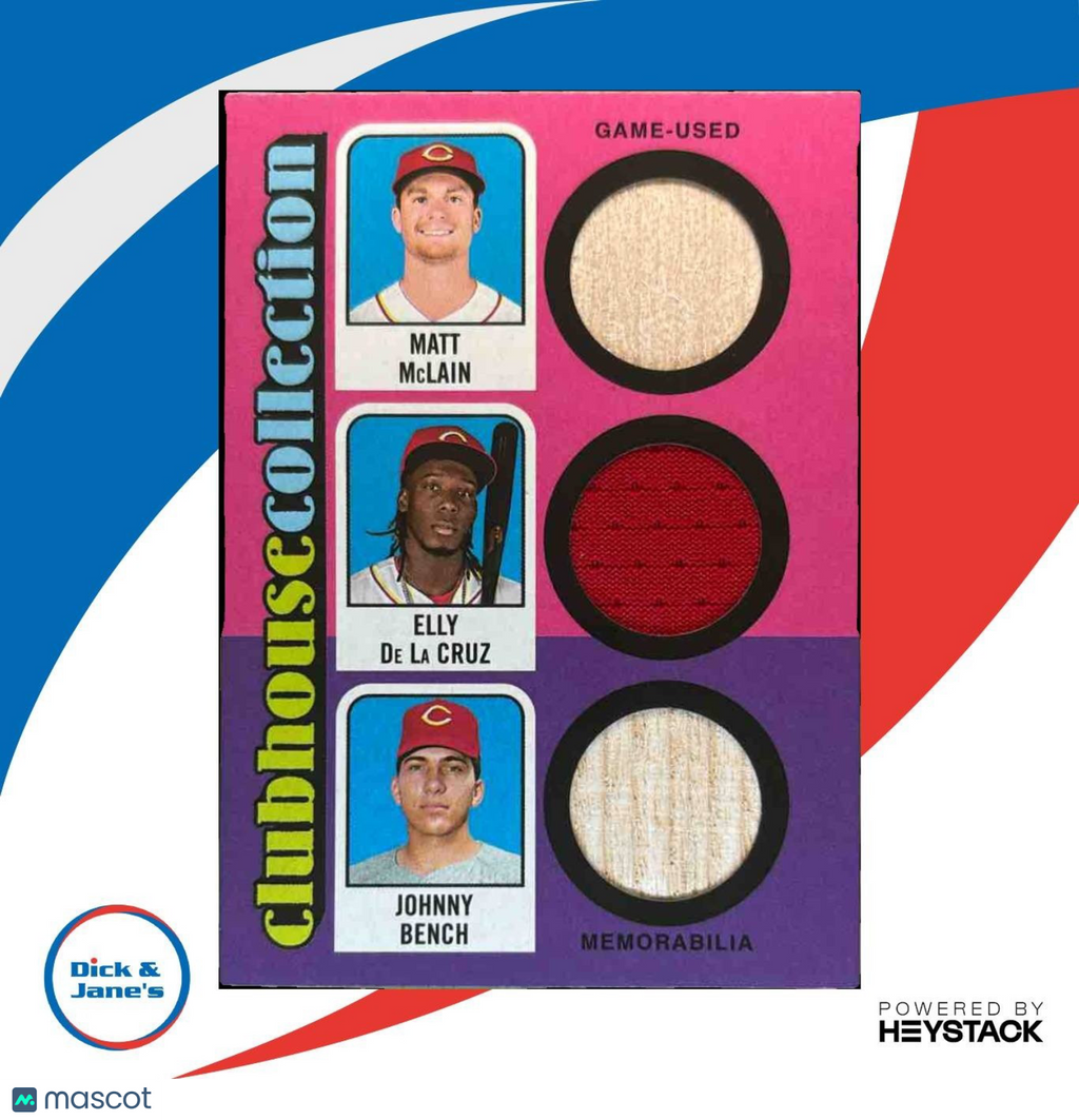 This rare MLB trading card features a triple relic of Elly De La Cruz, Matt McLain, and Johnny Bench from the 2024 Topps Heritage collection. Limited to only 25 copies, this card is a must-have for any serious collector. Own a piece of baseball history with this unique and highly collectible item. Listed With Mascot.