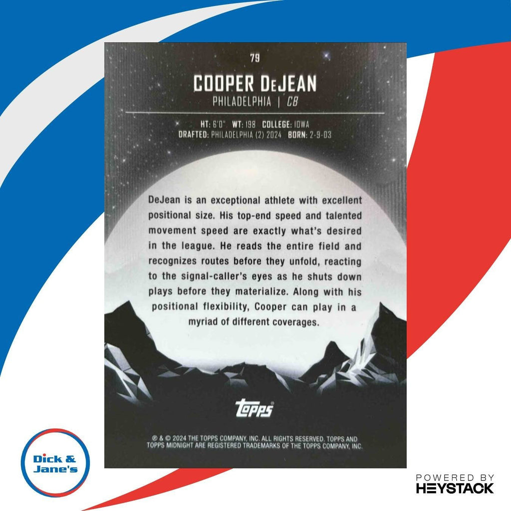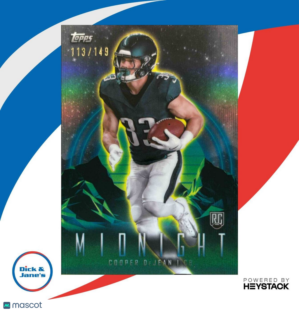 The 2024 Topps Midnight Cooper DeJean Morning RC trading card features a limited edition print run of 113/149. This rare NFL collectible showcases the Philadelphia Eagles rookie with a striking design by Topps. A must-have for any football card enthusiast looking to add a unique piece to their collection. Listed With Mascot.