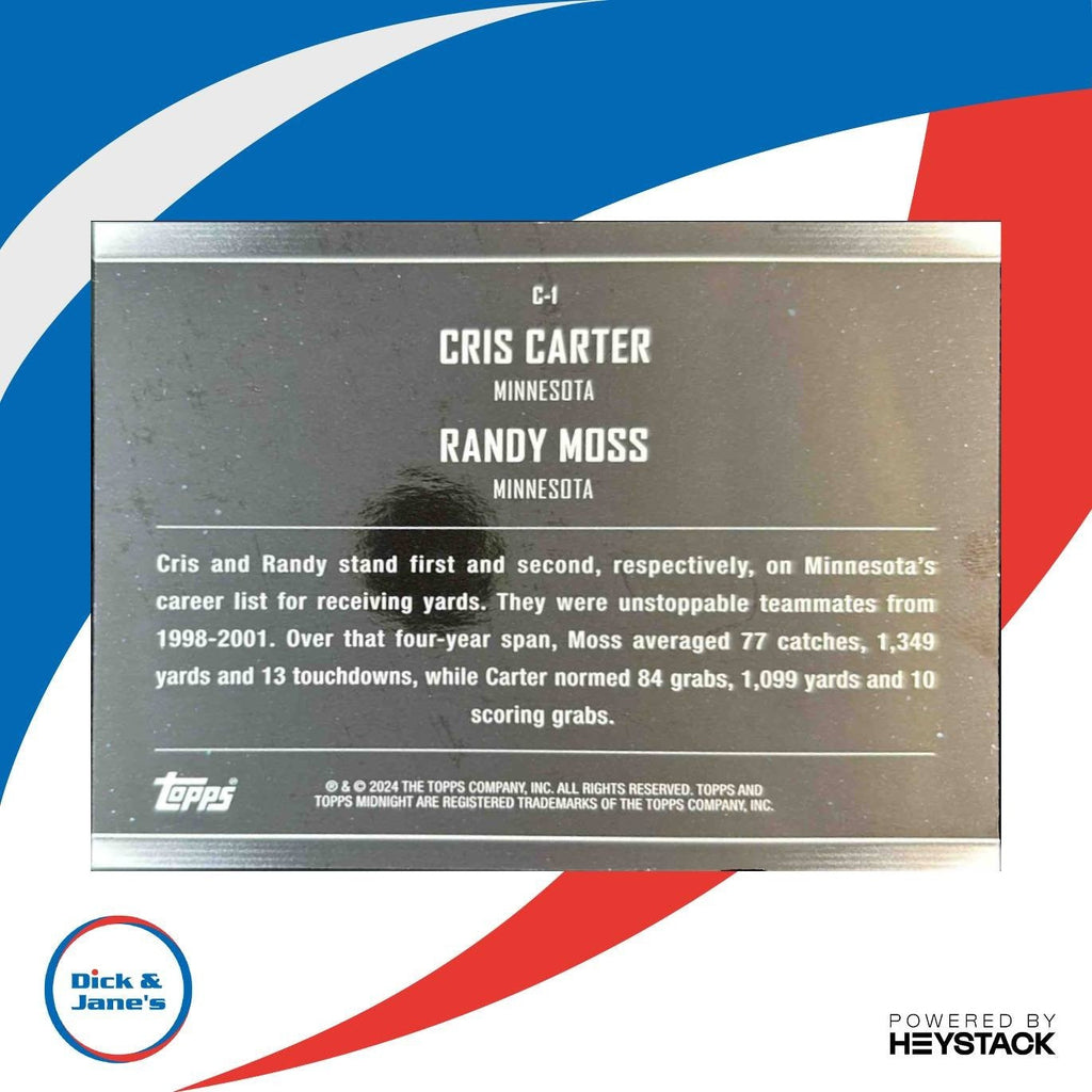 : Limited edition 2024 Topps Midnight NFL trading card featuring legendary Minnesota Vikings wide receivers Cris Carter and Randy Moss. The stunning Constellations design showcases the dynamic duo in action. A must-have for any football card collector or Vikings fan. Get your hands on this rare and collectible card before it's gone! Listed With Mascot.