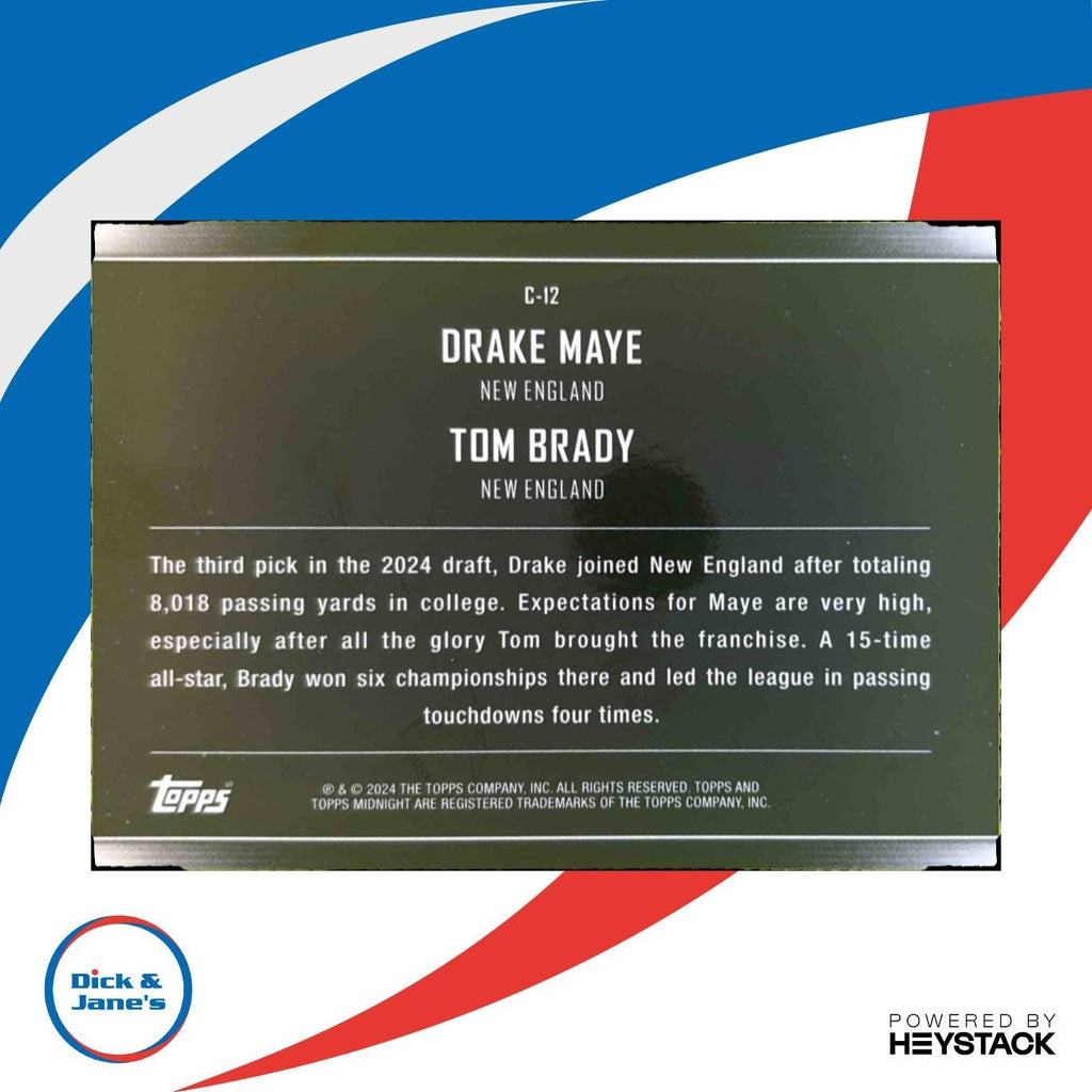 Own a piece of sports history with this rare 2024 Topps Midnight Drake Maye Tom Brady Constellations Moon Beam RC Patriots trading card. Featuring rookie card status for Drake Maye and Tom Brady, this NFL collectible is a must-have for any football fan. Don't miss out on adding this gem to your collection! Listed With Mascot.